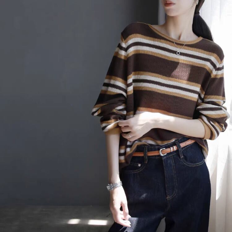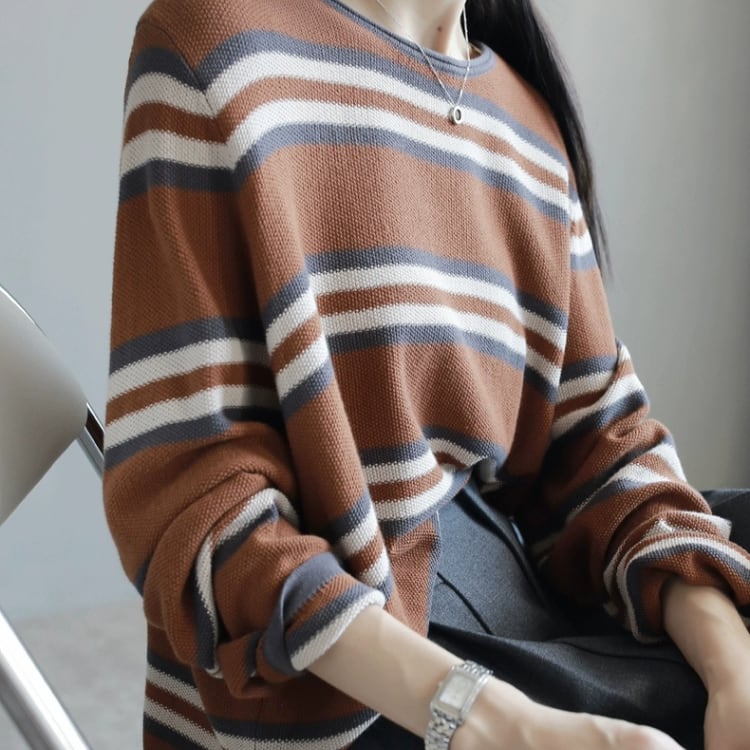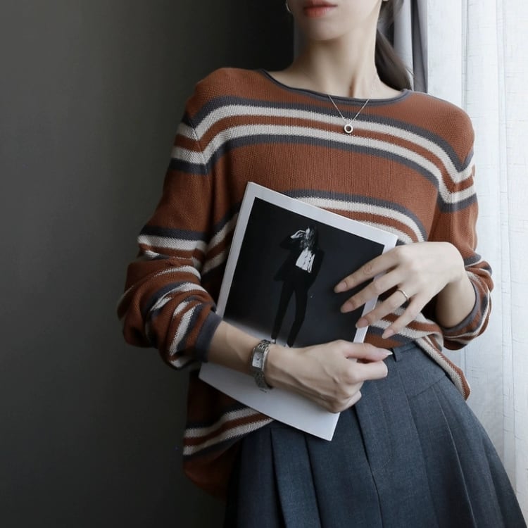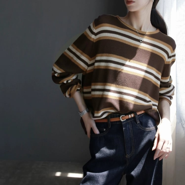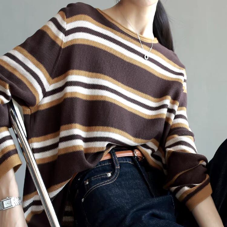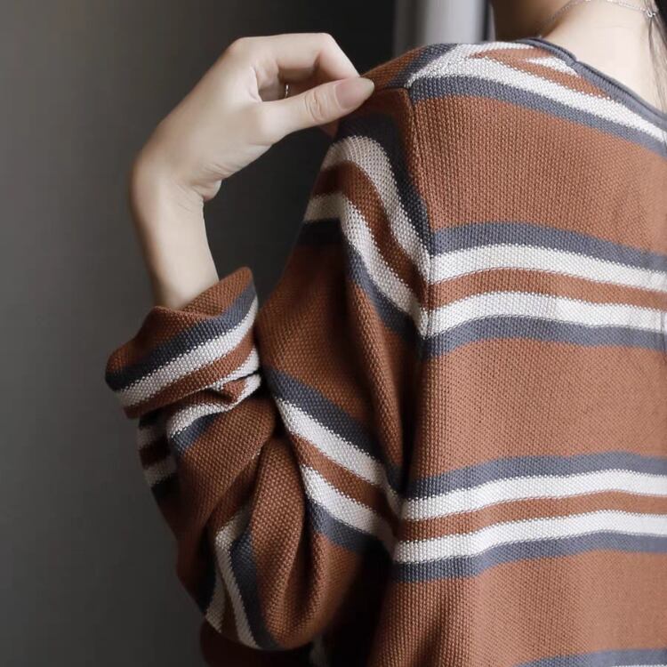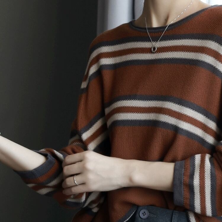 大きめのマルチボーダー柄が印象的な、ゆったりとしたシルエットのカットソーです。