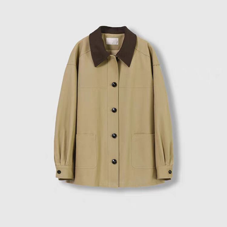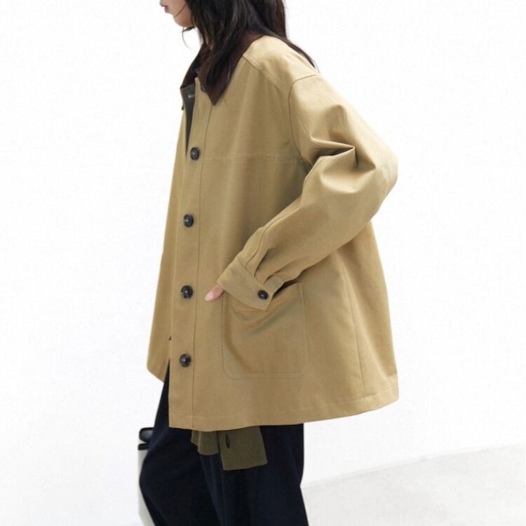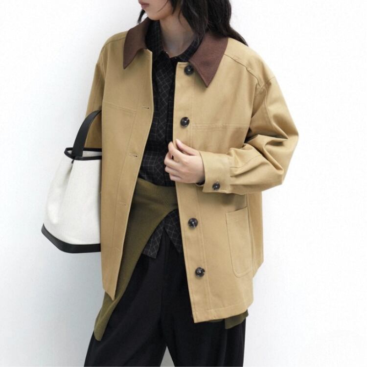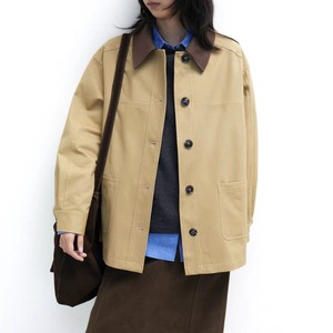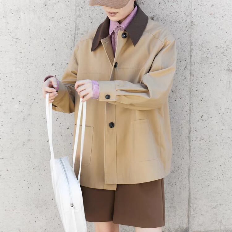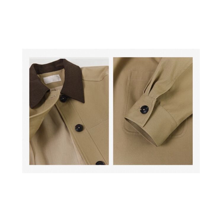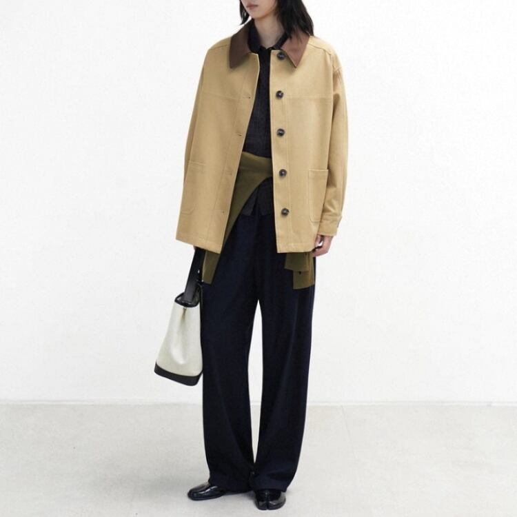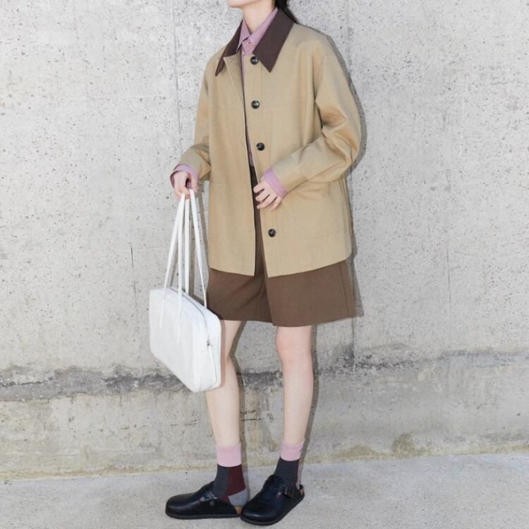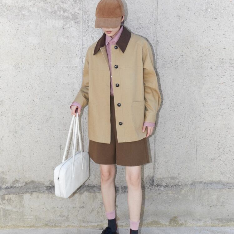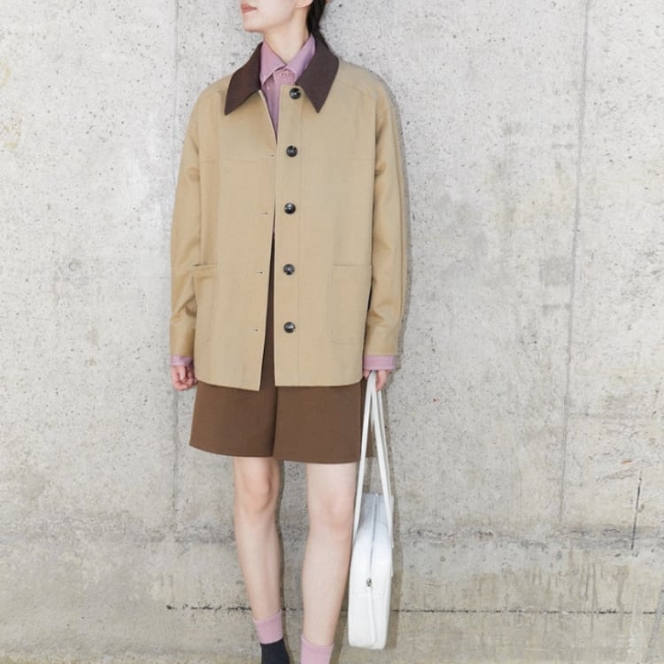 カーキのボディにダークブラウンの襟が絶妙なアクセントとなり、コーディネートに個性をプラスしてくれます。