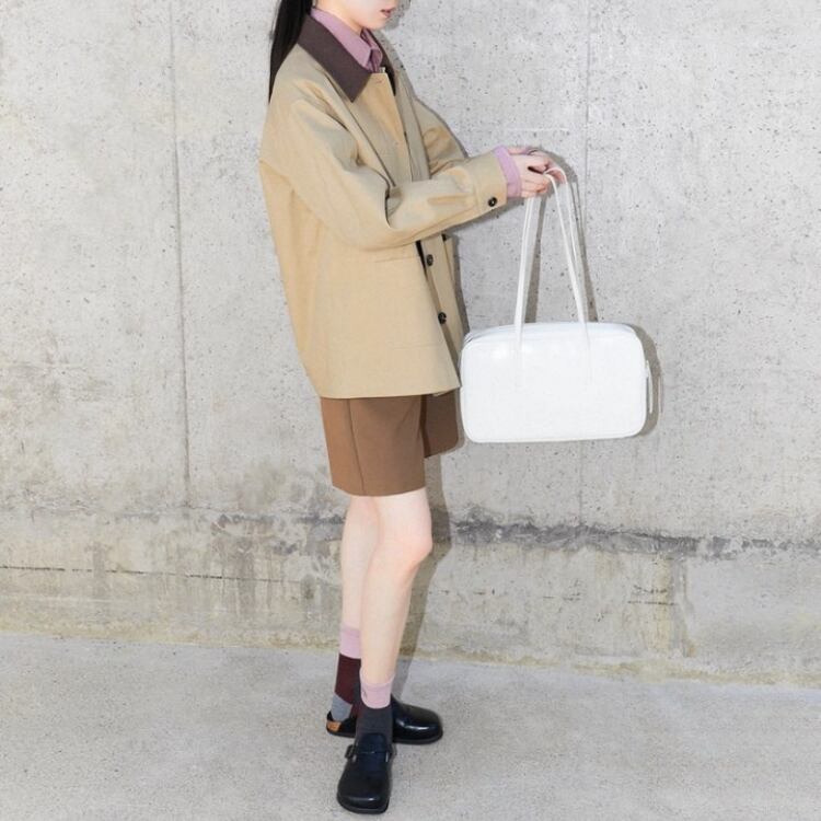 フロント下部に配置されたパッチポケットが、すっきりとした印象を与えつつ、機能性も兼ね備えています。