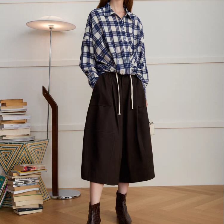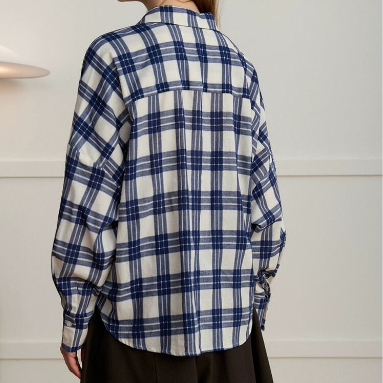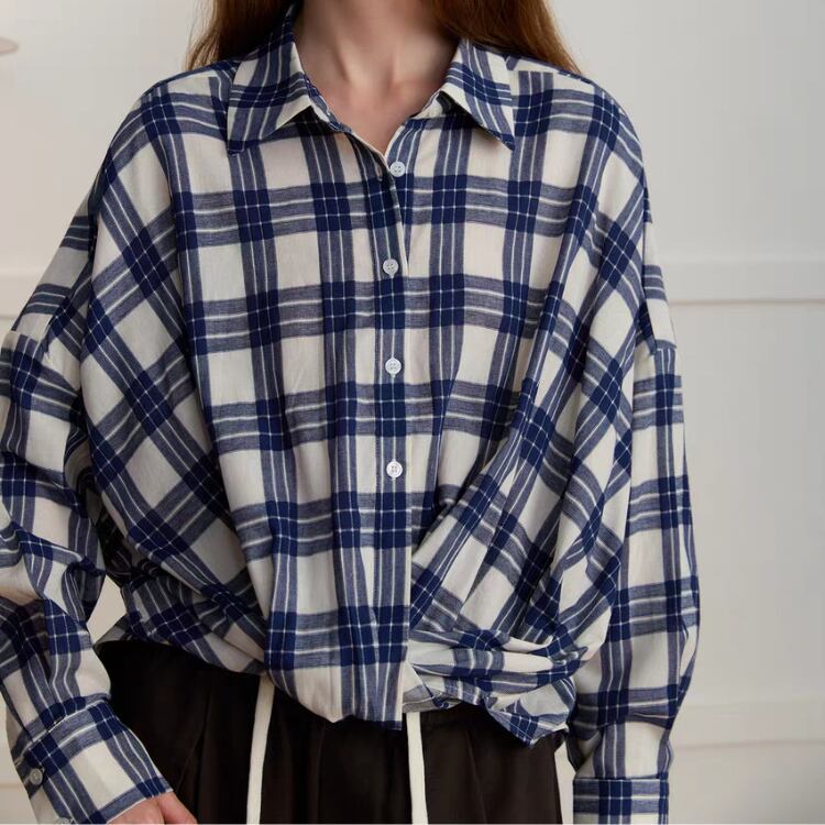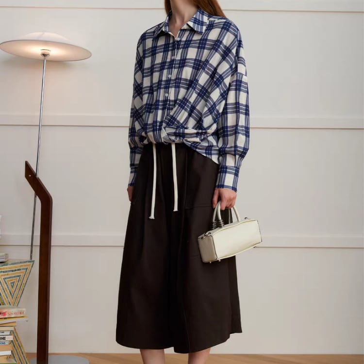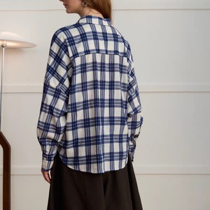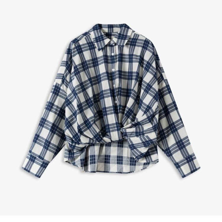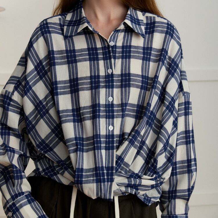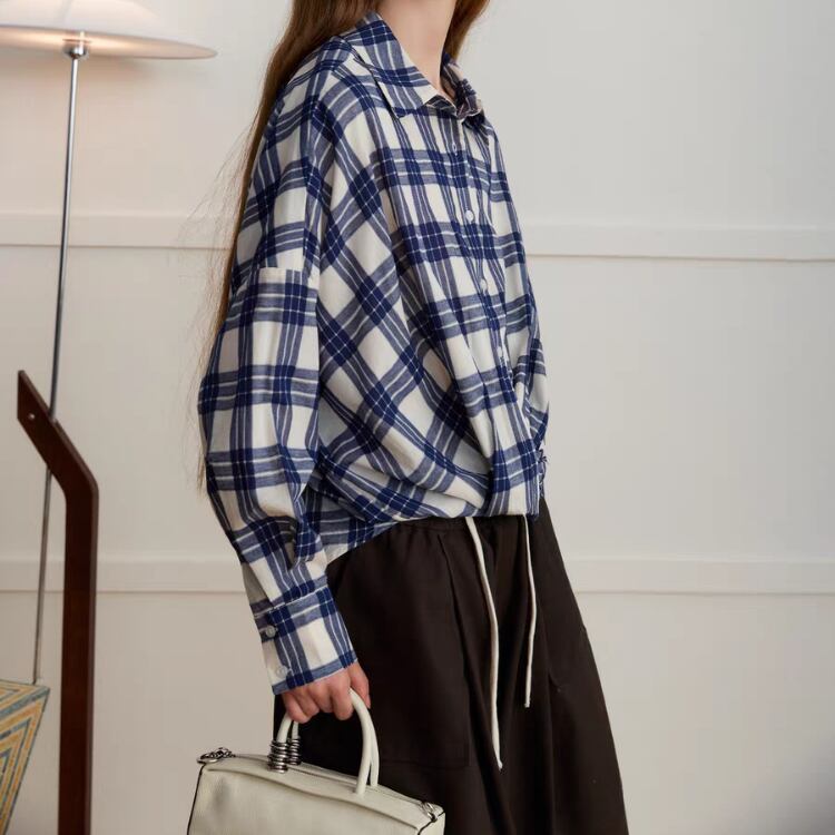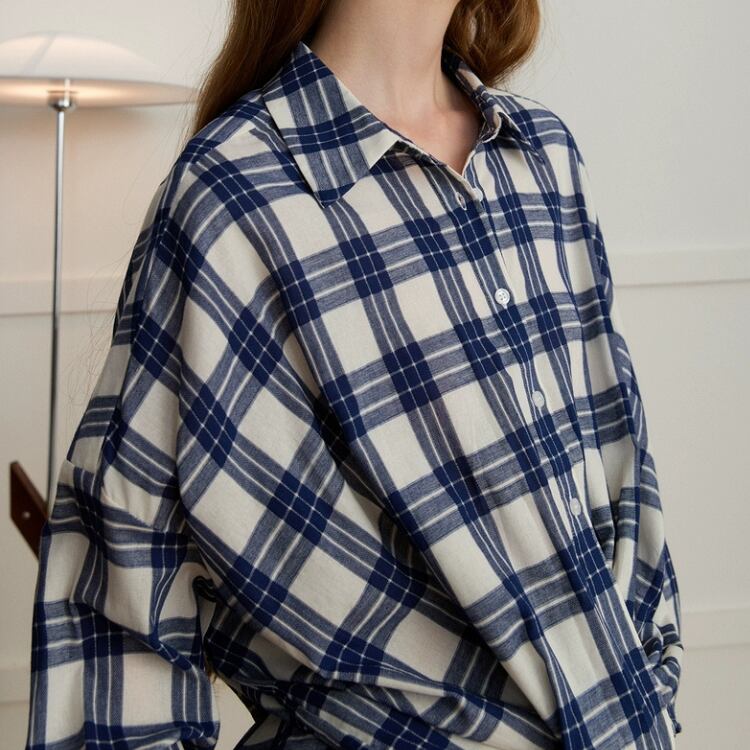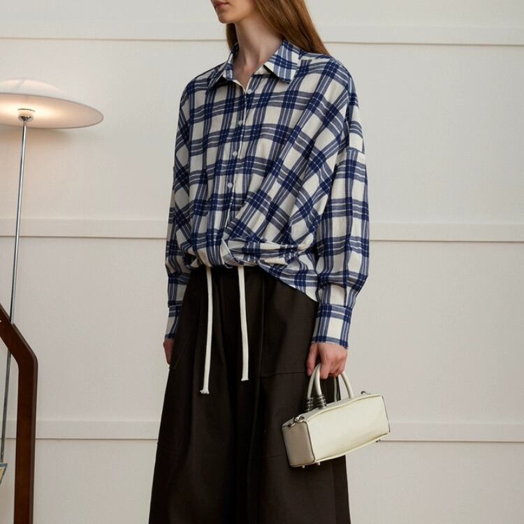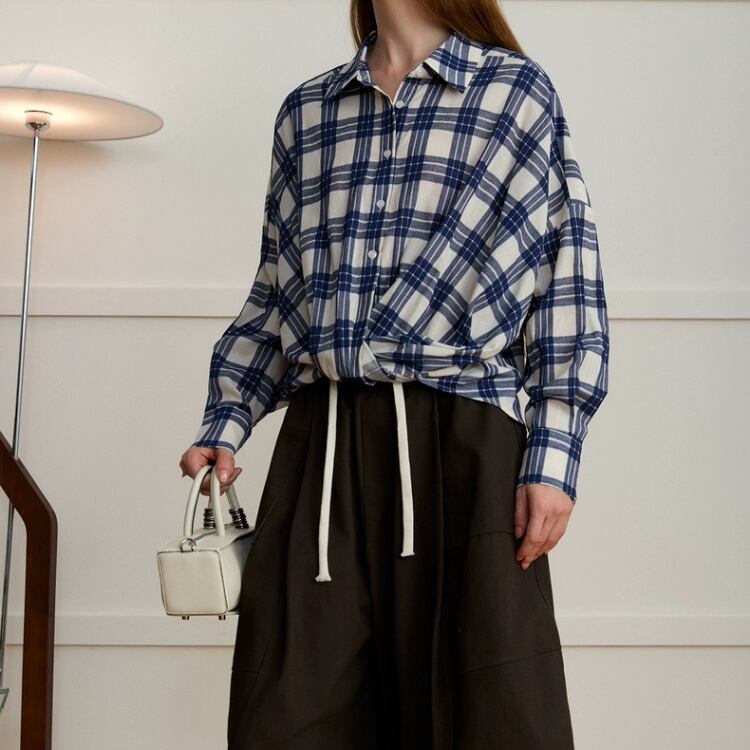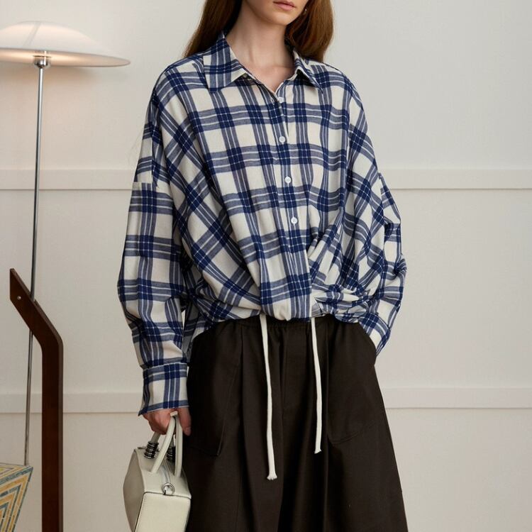 先染めチェック柄フロントギャザー裾シャツ 1408