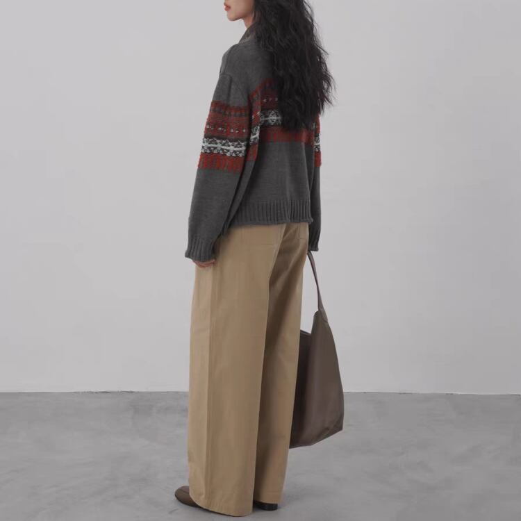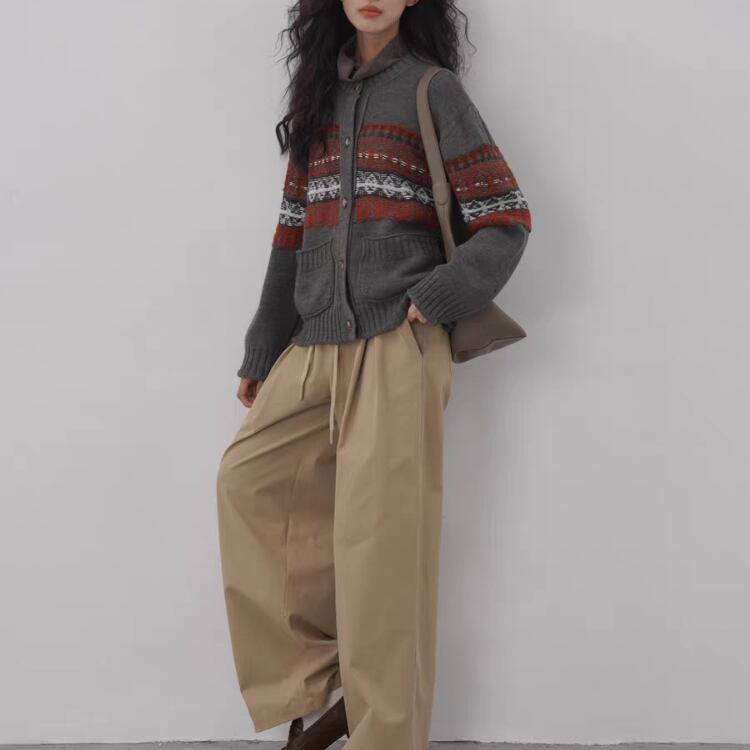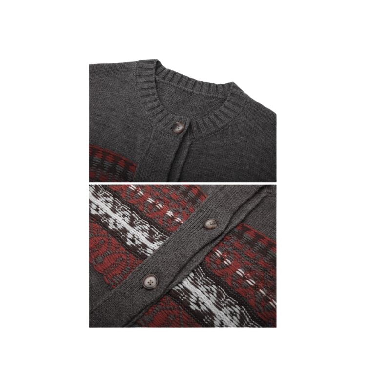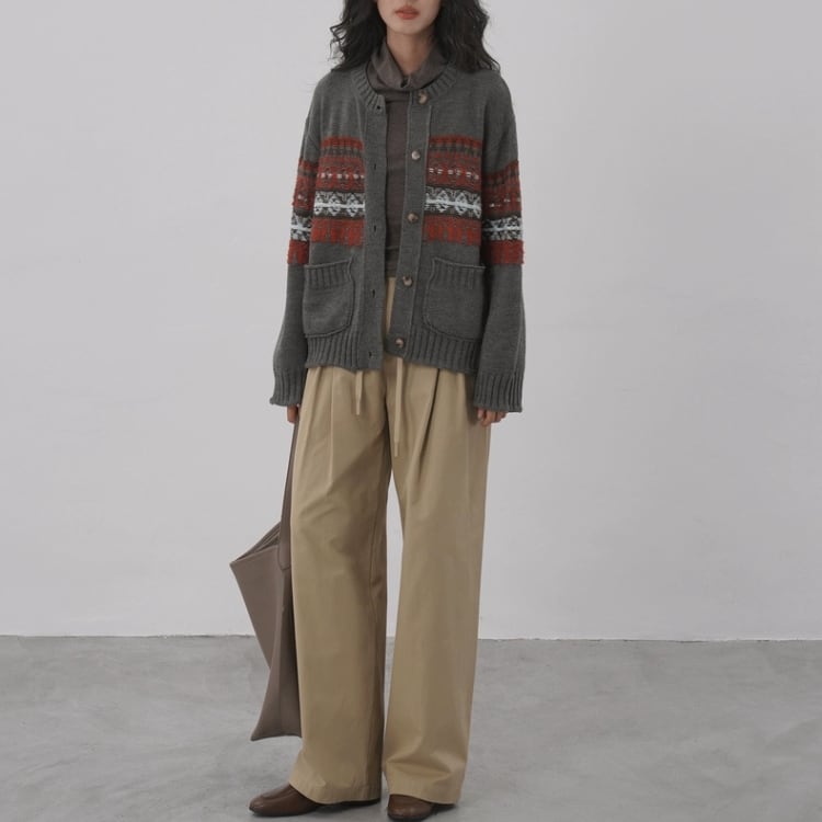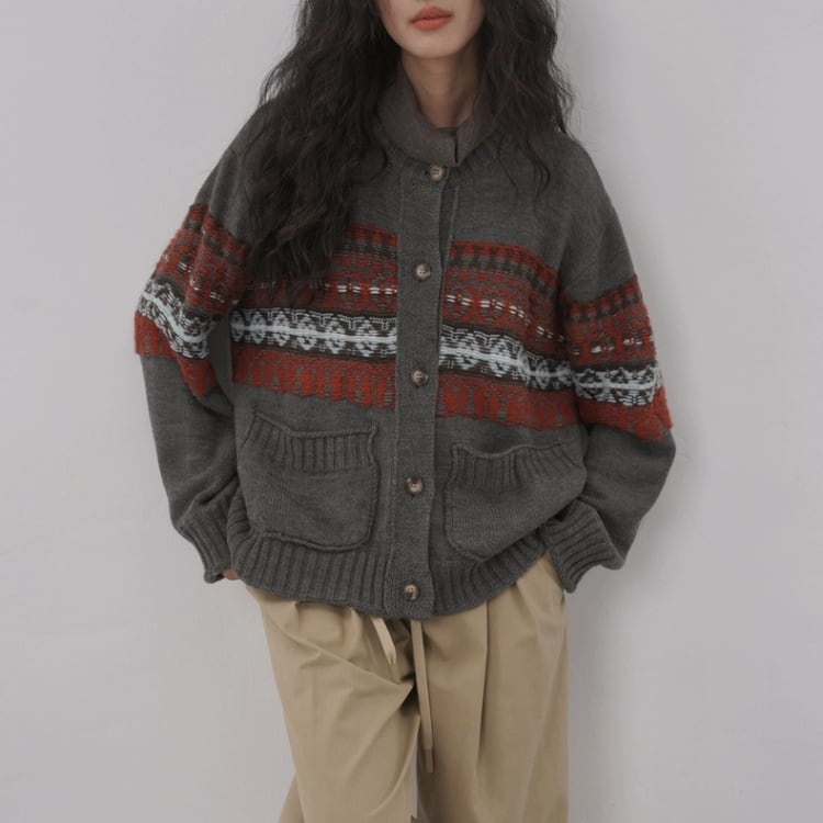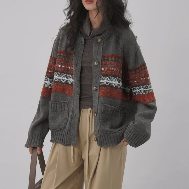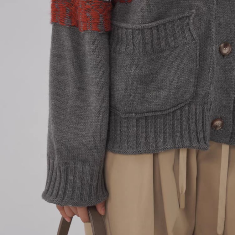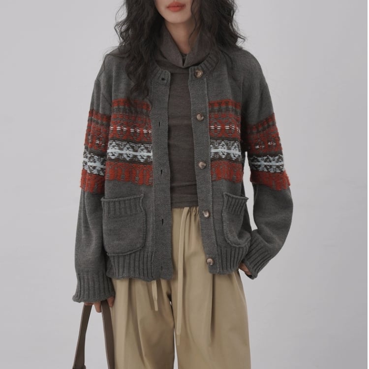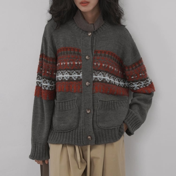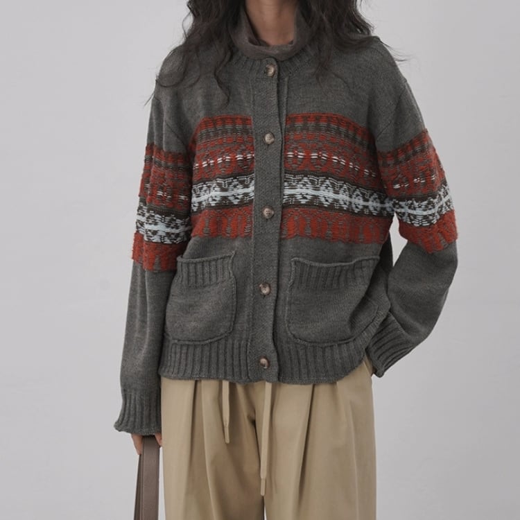 柄編み配色クルーネックニットカーディガン 1412
