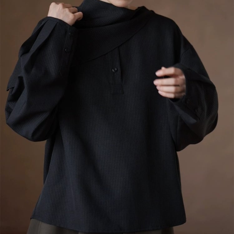 格子柄アシンメトリーカラーハーフ釦ブラウス 1420