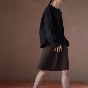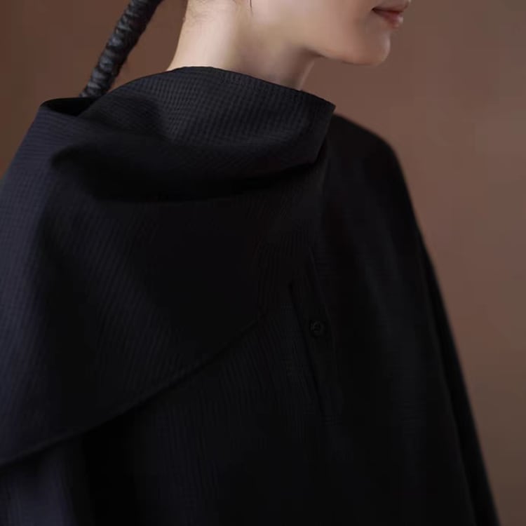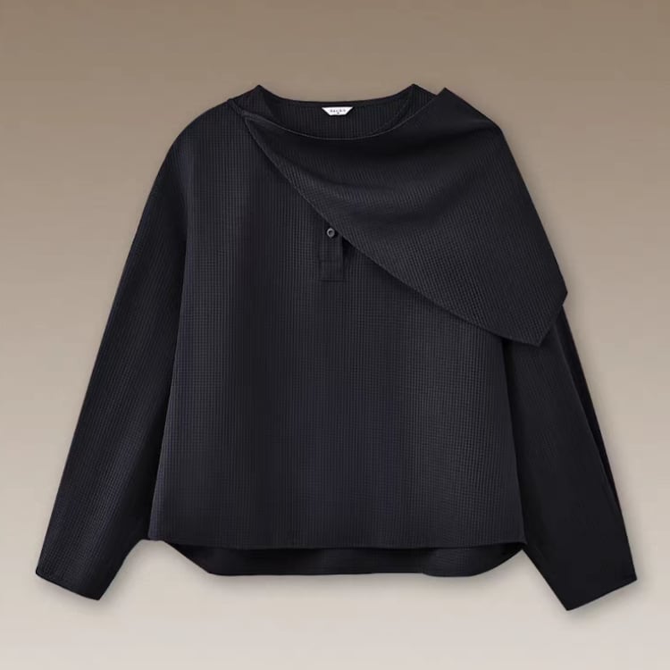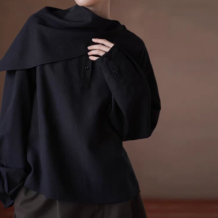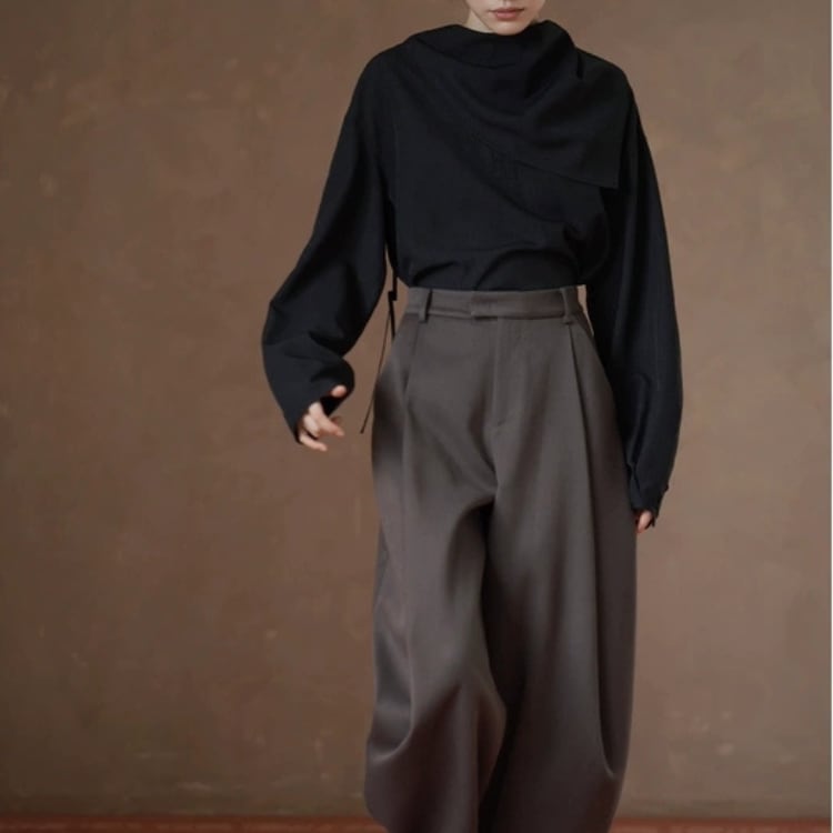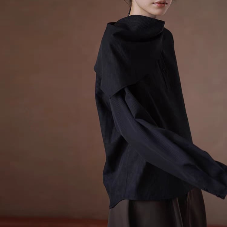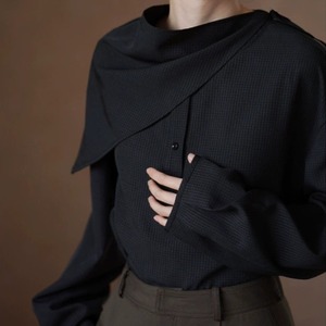 片側だけスカーフのようになびいたデザインのアシンメトリー襟が、おしゃれで個性的。