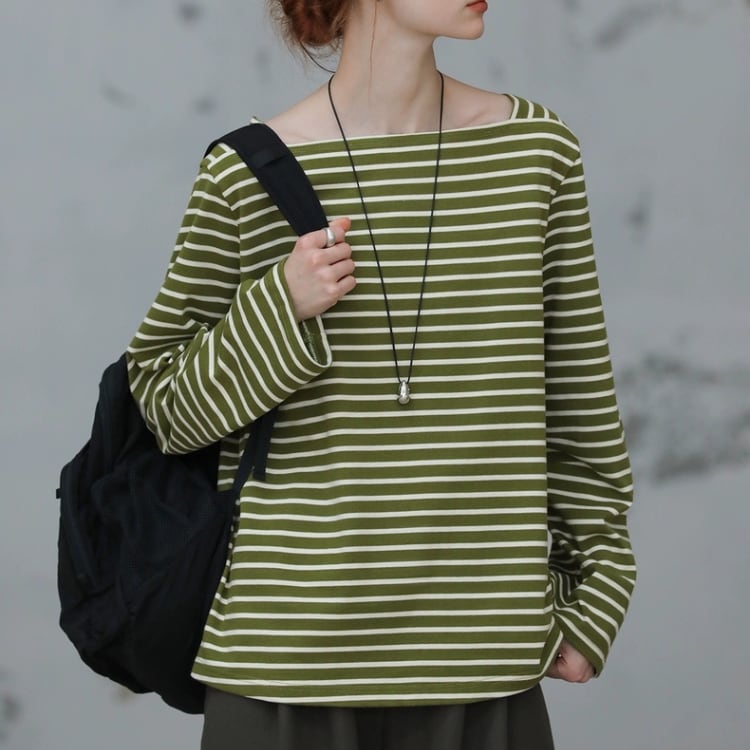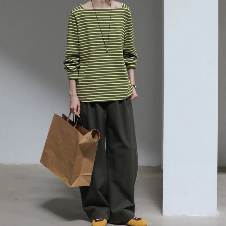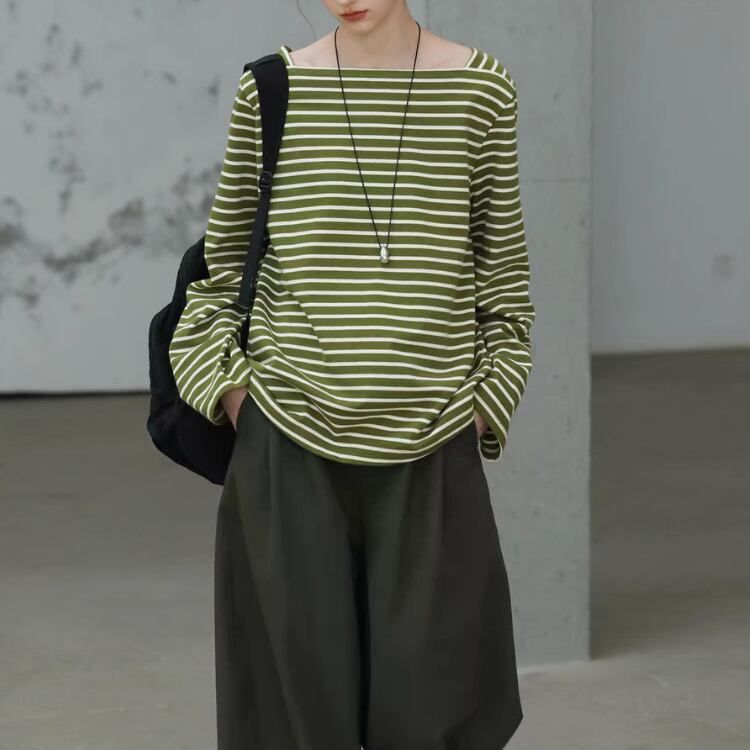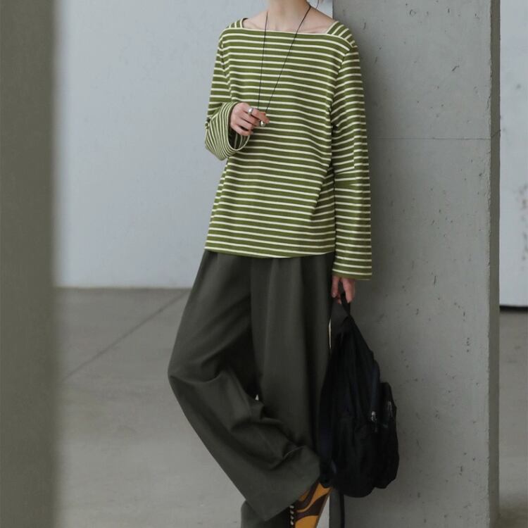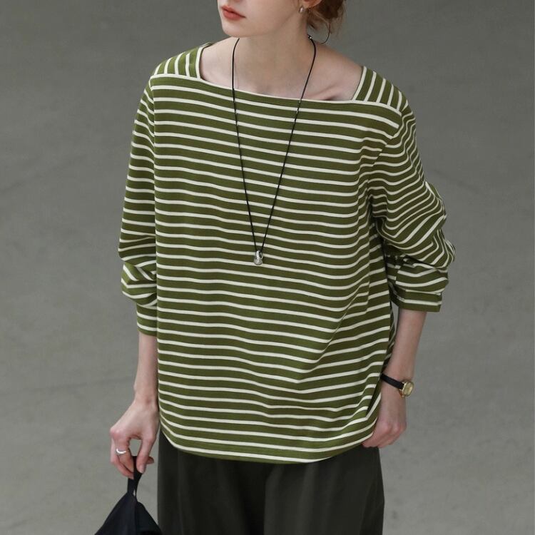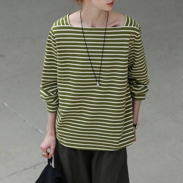 ボートネックですが、開きすぎないデザインで、日常使いやお出かけシーンにもぴったりです。