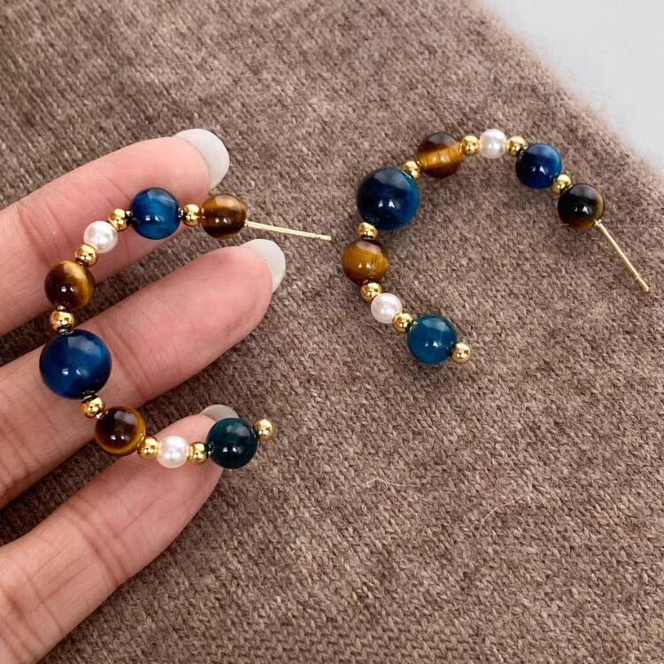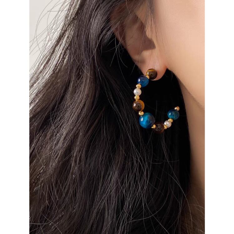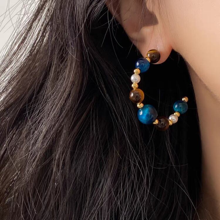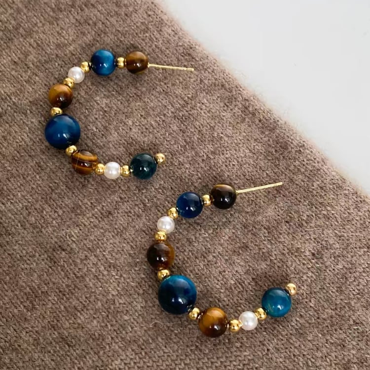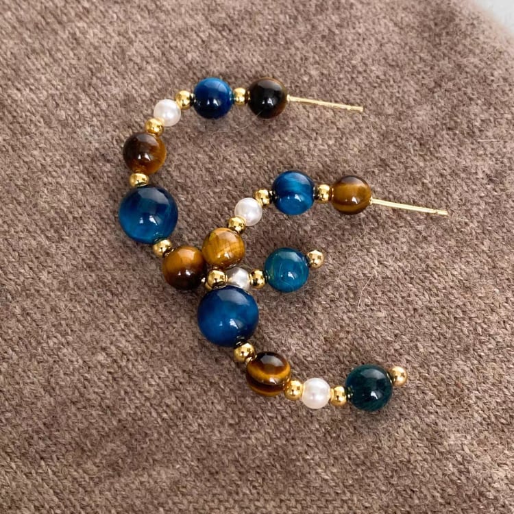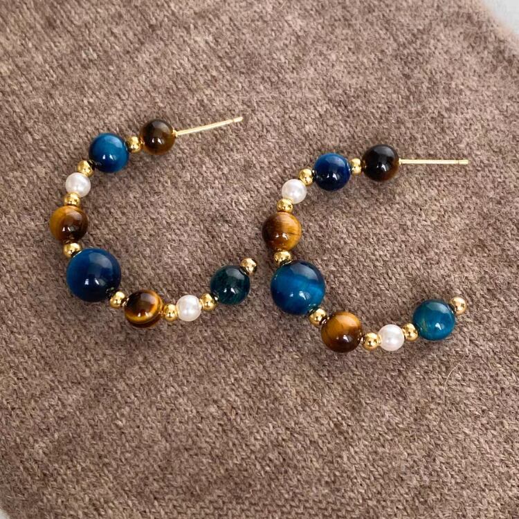 ブルーやブラウンのビーズがゴールドで美しく映え、シックな印象を与えます。