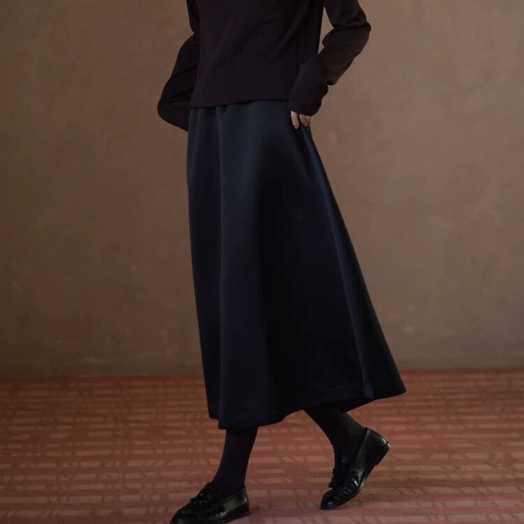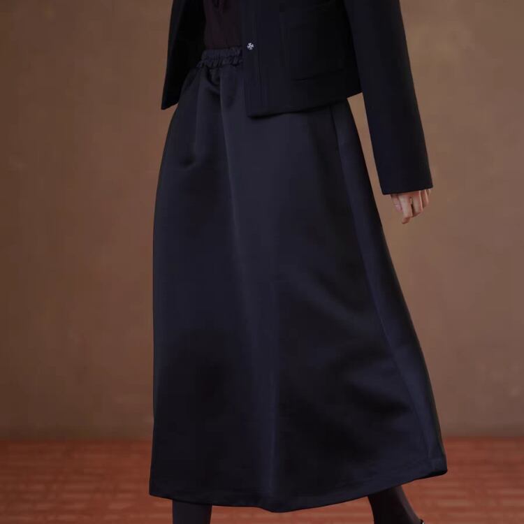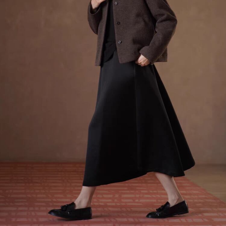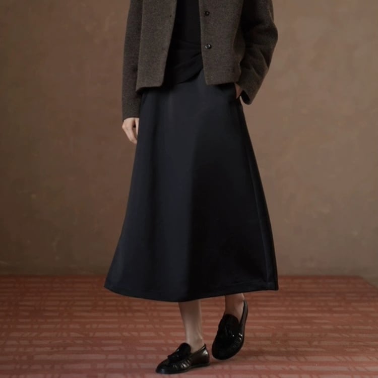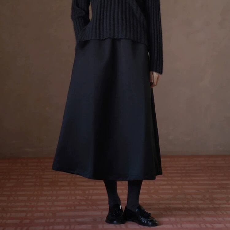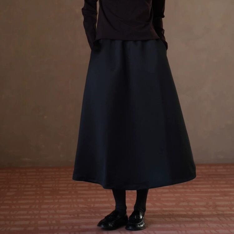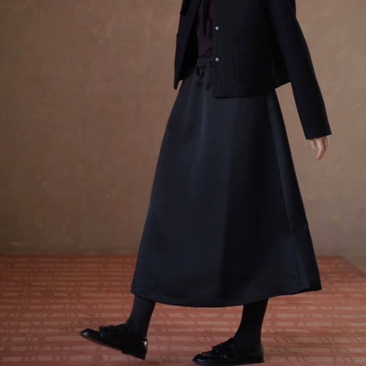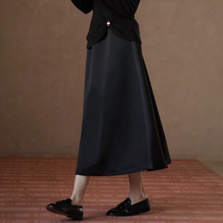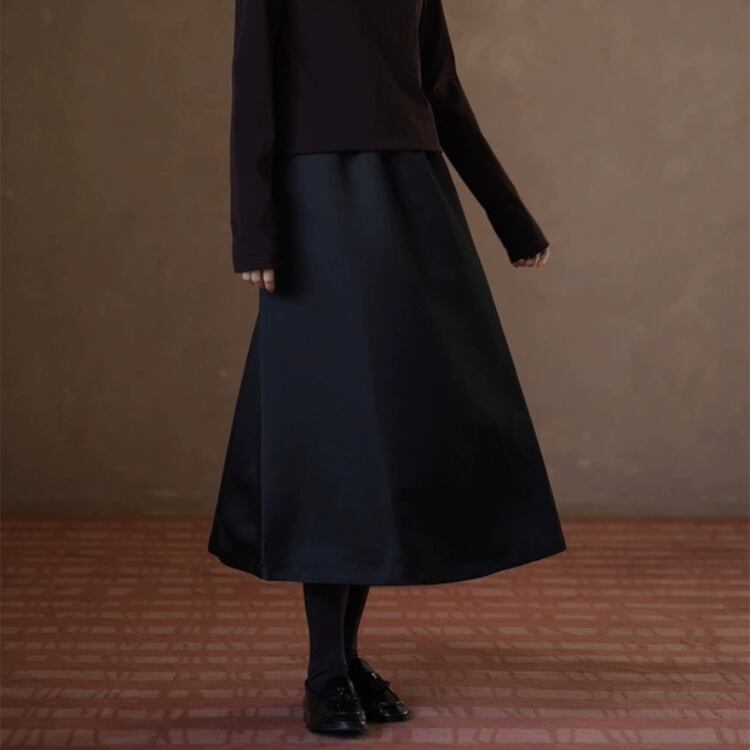 張りのあるサテン素材が、ふわっとしたフレアーを作り出し、フェミニンな印象を与えます。