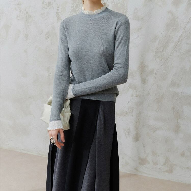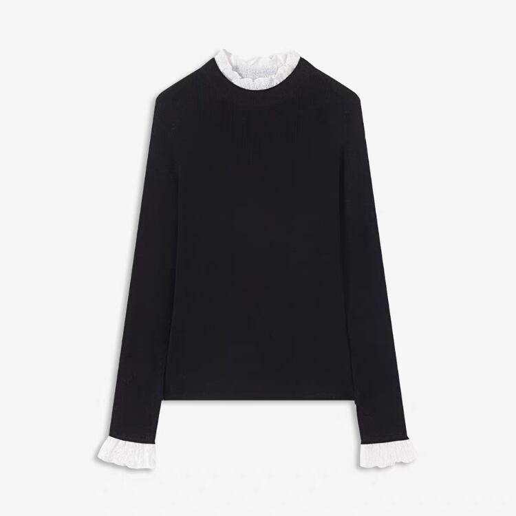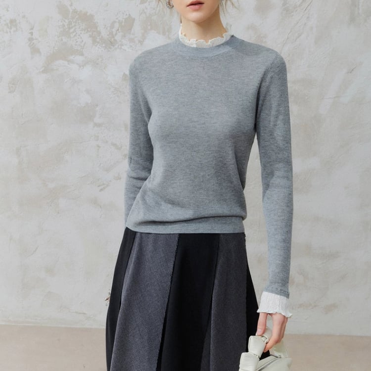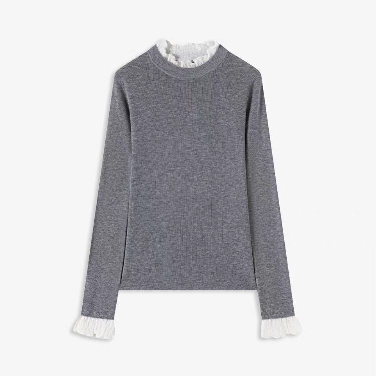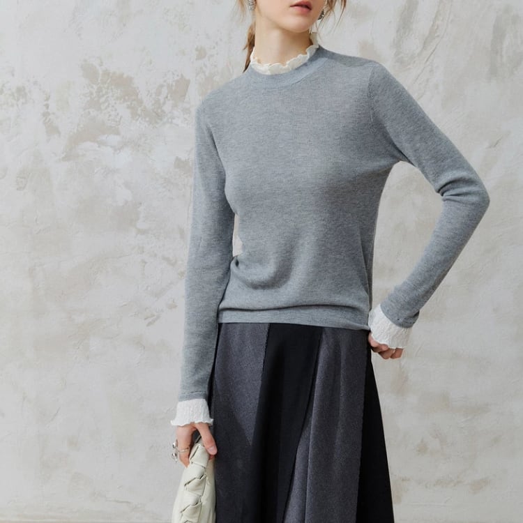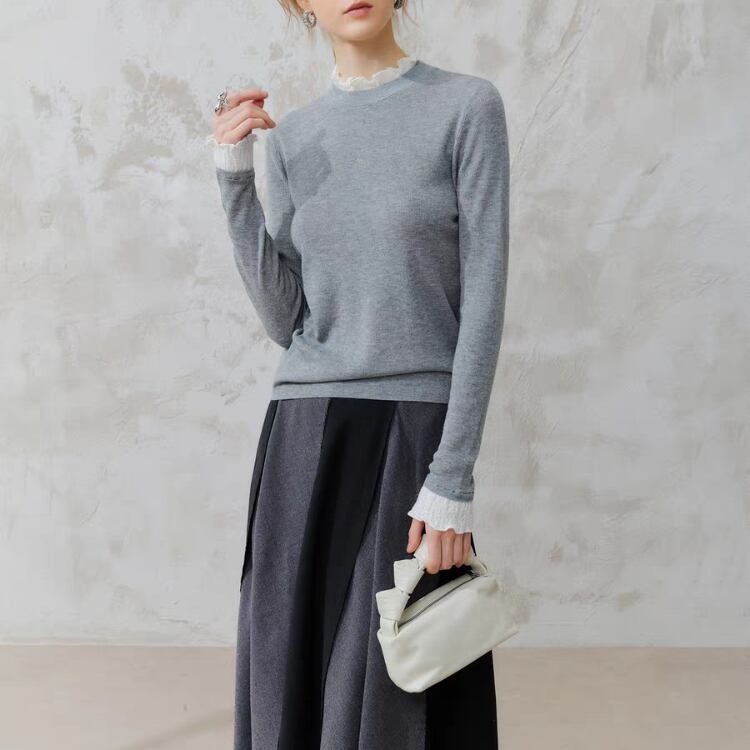 襟袖口レース付きクルーネックニットプルオーバー 1456
