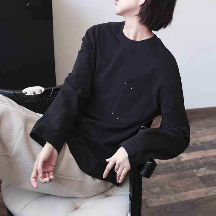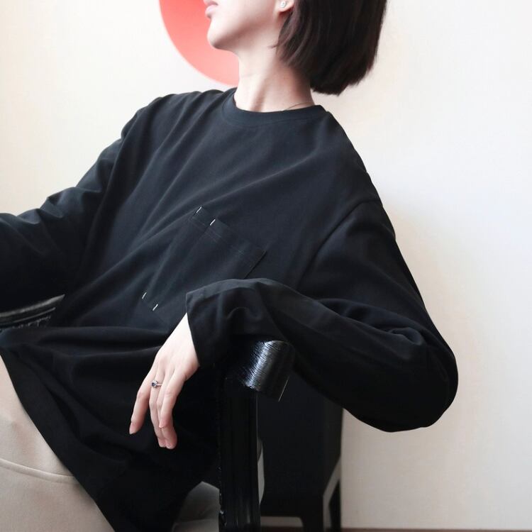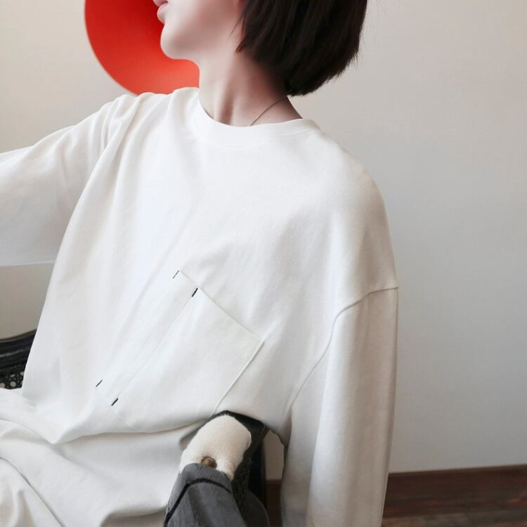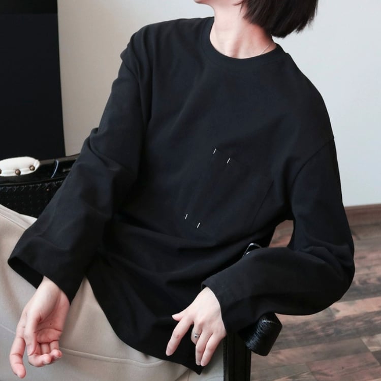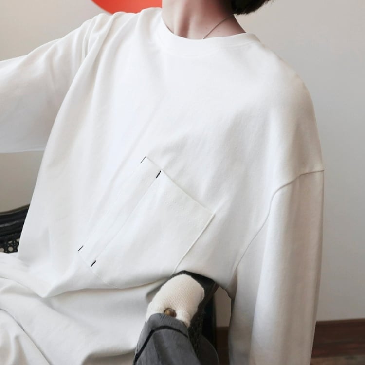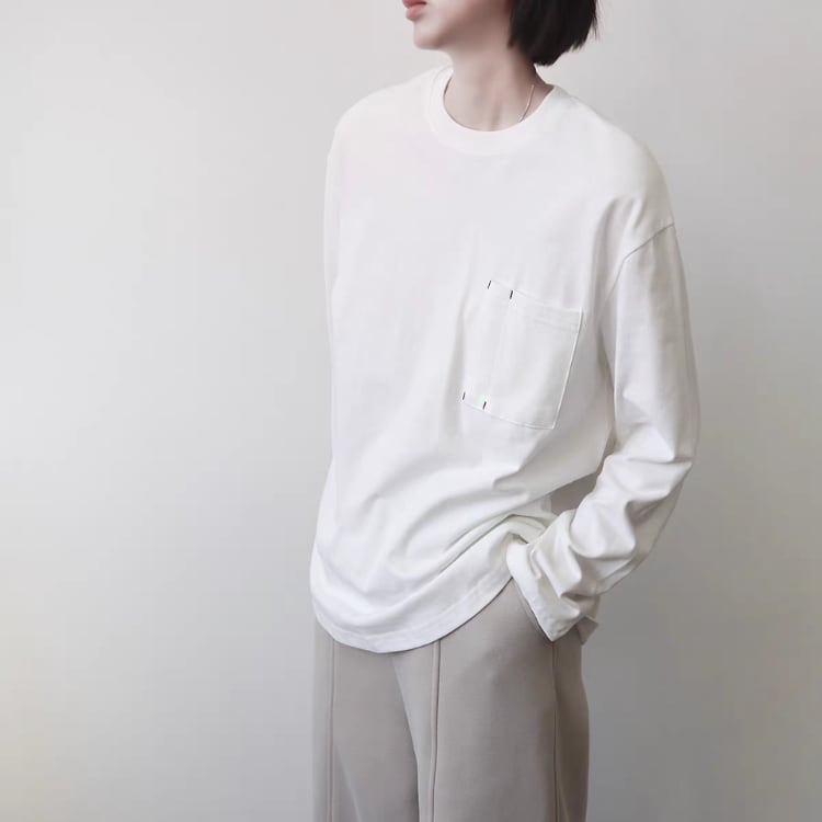 左胸にポケットを付けた、シンプルでベーシックな型の長袖カットソー。