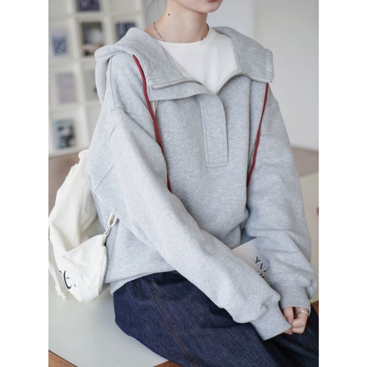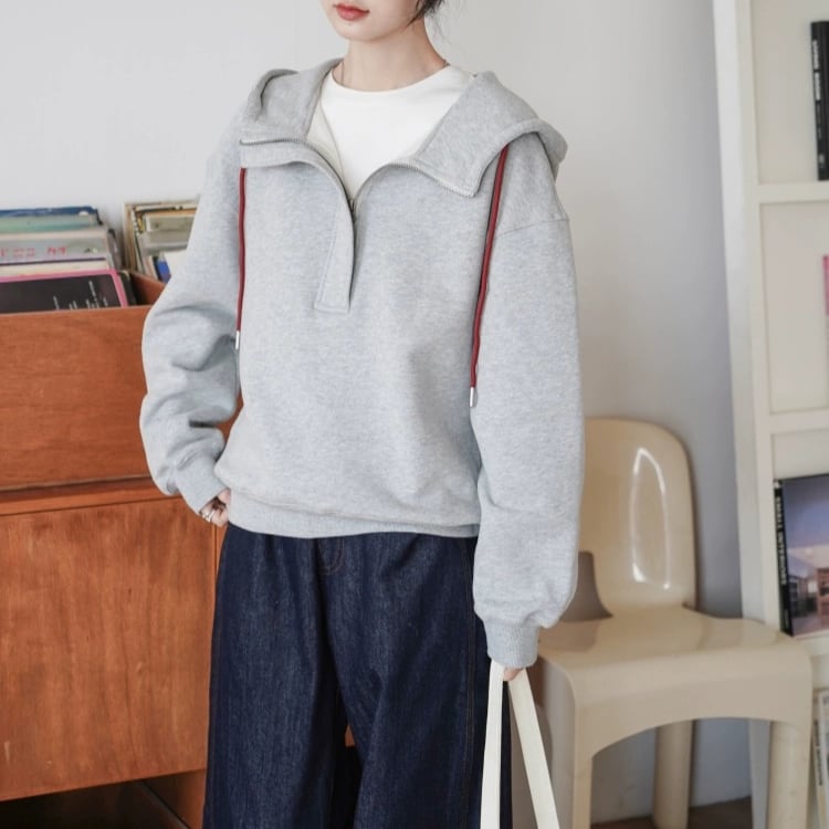着脱が楽ちんなだけでなく、ジップを下げることで襟のように見せられるのが魅力です。