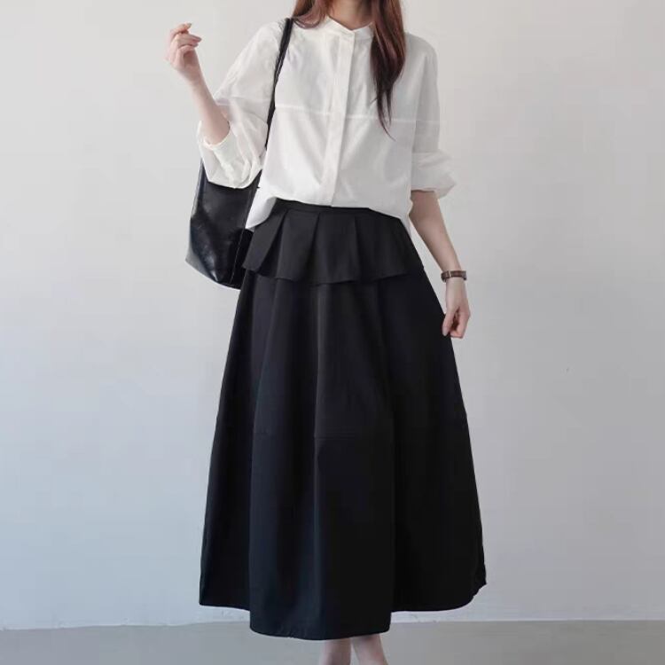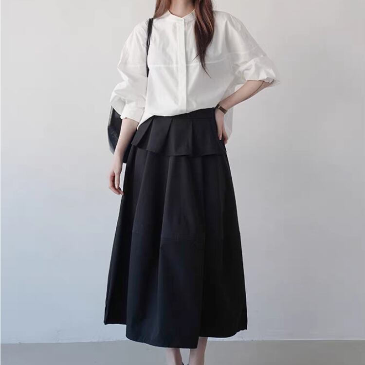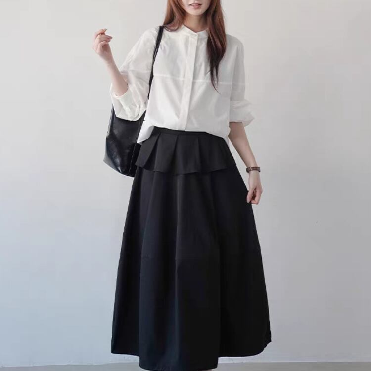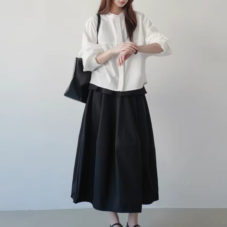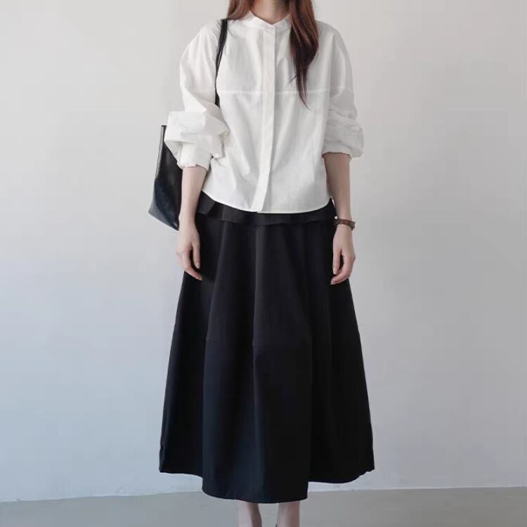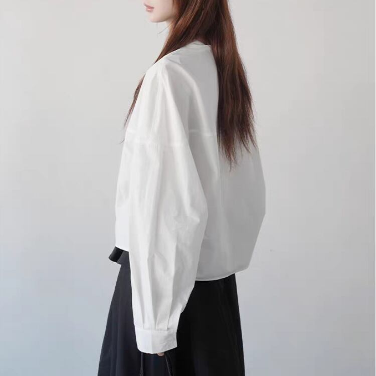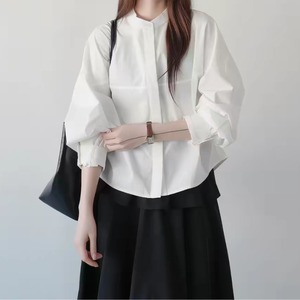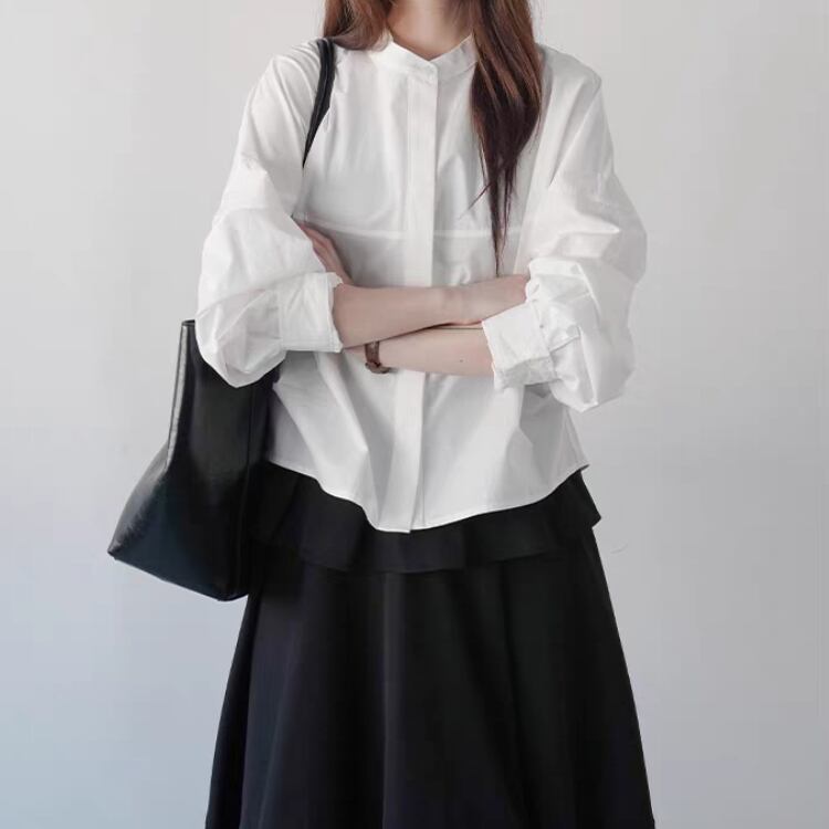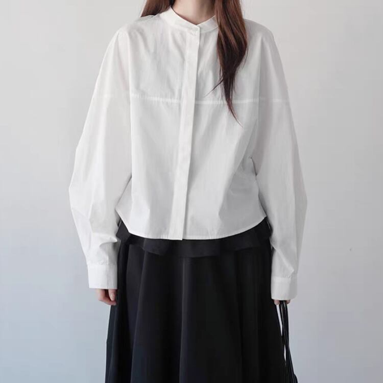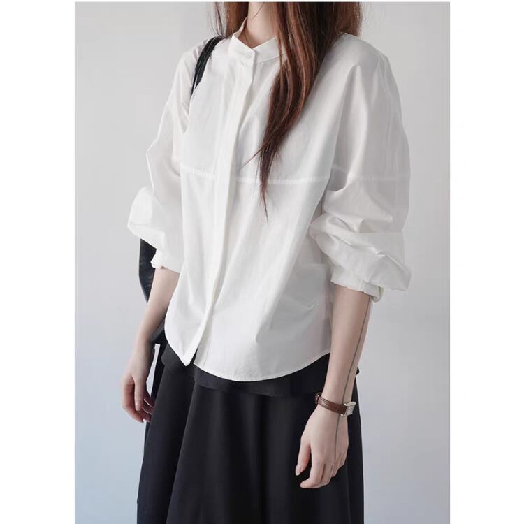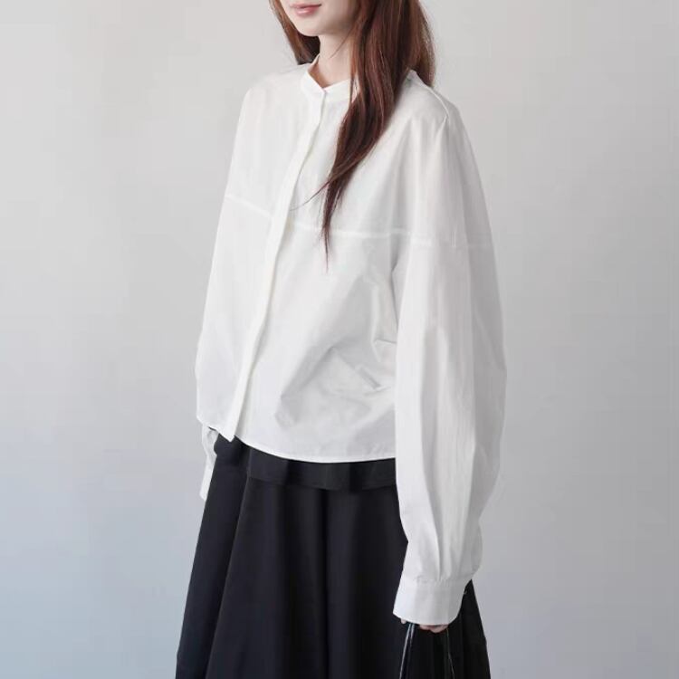 シンプルなバンドカラーが大人の魅力を引き立てるブラウス。