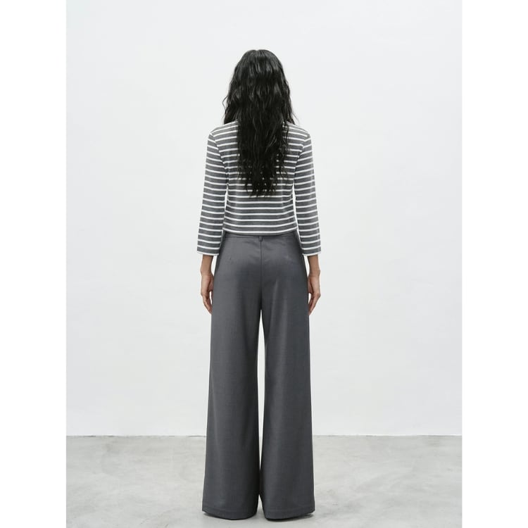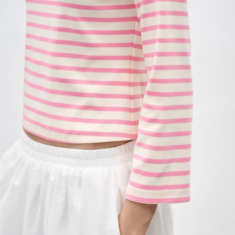 細い線のボーダー柄は、優しい雰囲気を演出し、カジュアルな印象を与えつつも洗練されたスタイルを実現します。