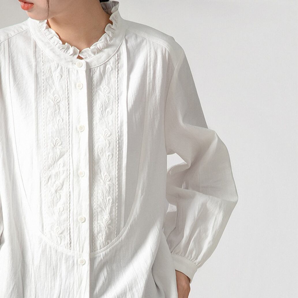 小さめのフリルスタンドカラーが、フェミニンな雰囲気を一層引き立ててくれます。