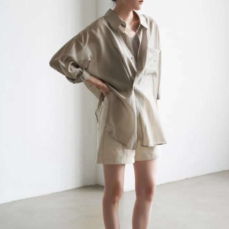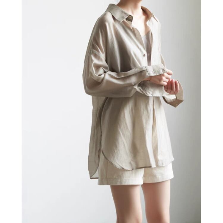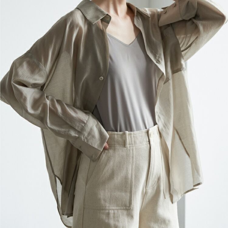 人気のシアー素材のシャツは、羽織っても一枚着でもインナーとしても着られ、便利です。