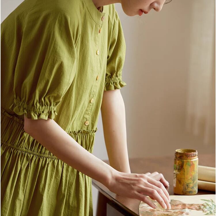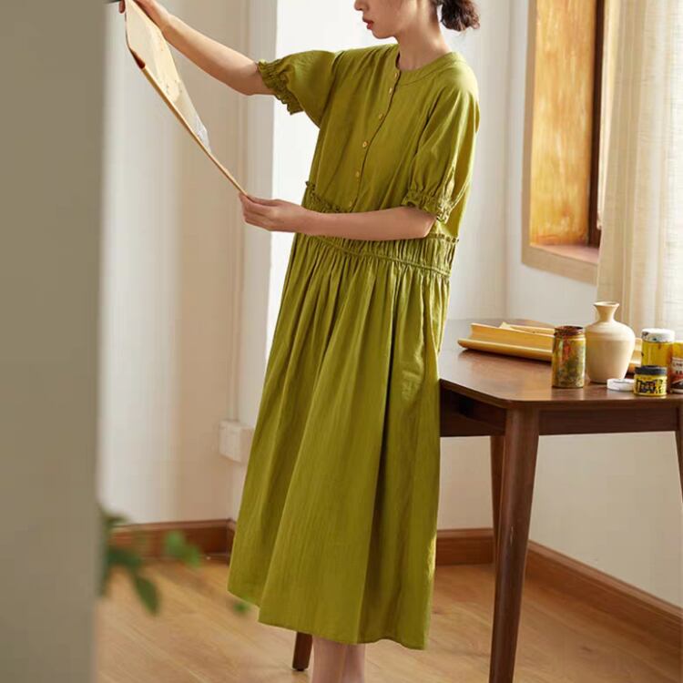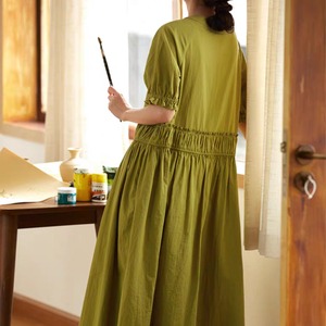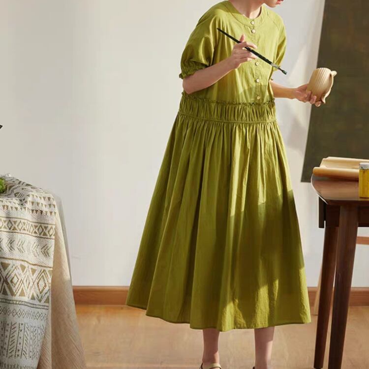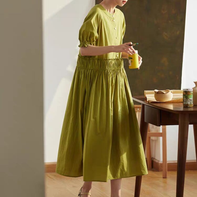 フロントハーフ釦ウエストギャザー切り替えワンピース 0315