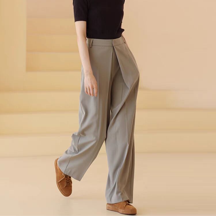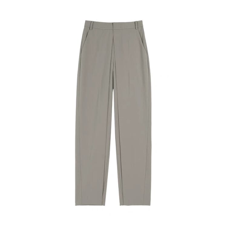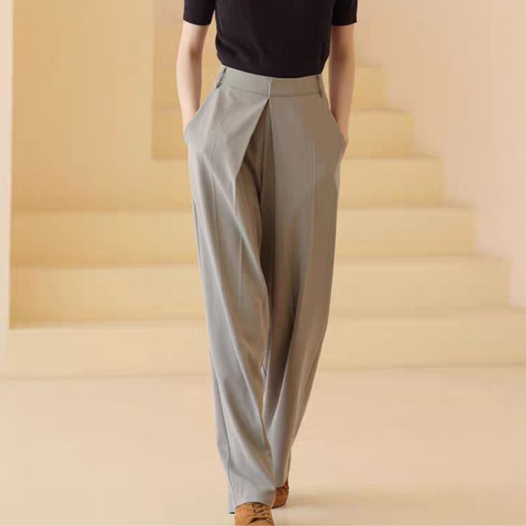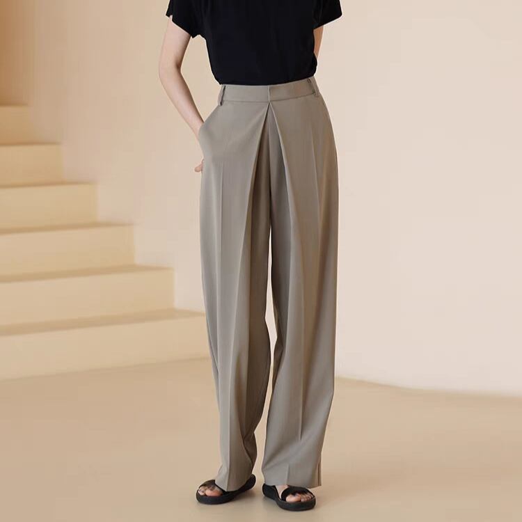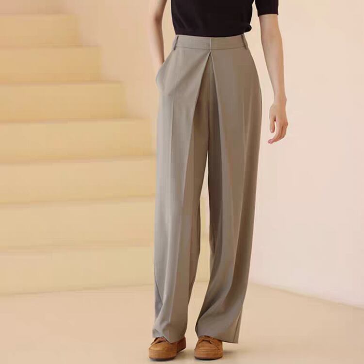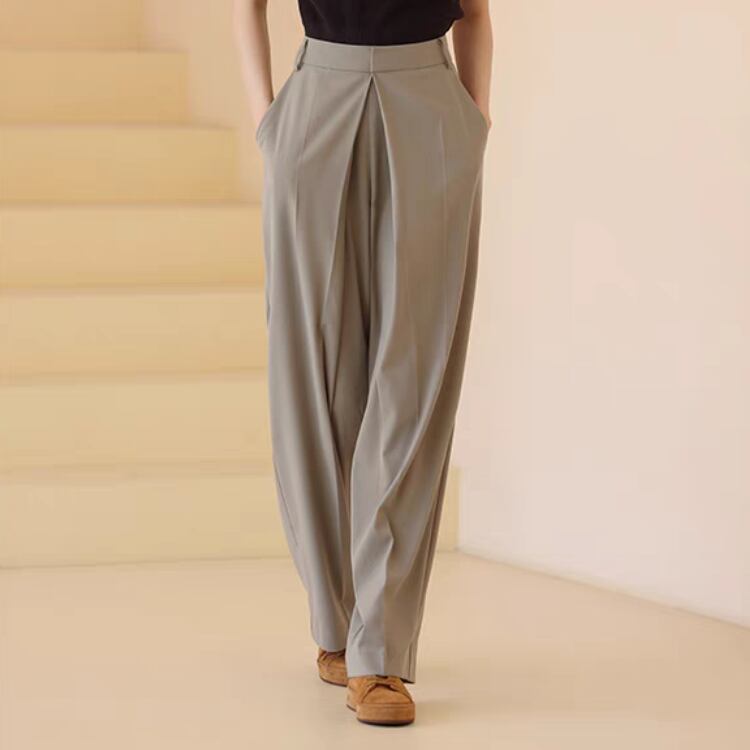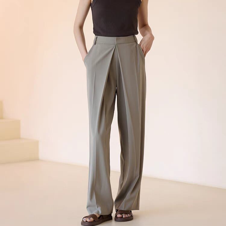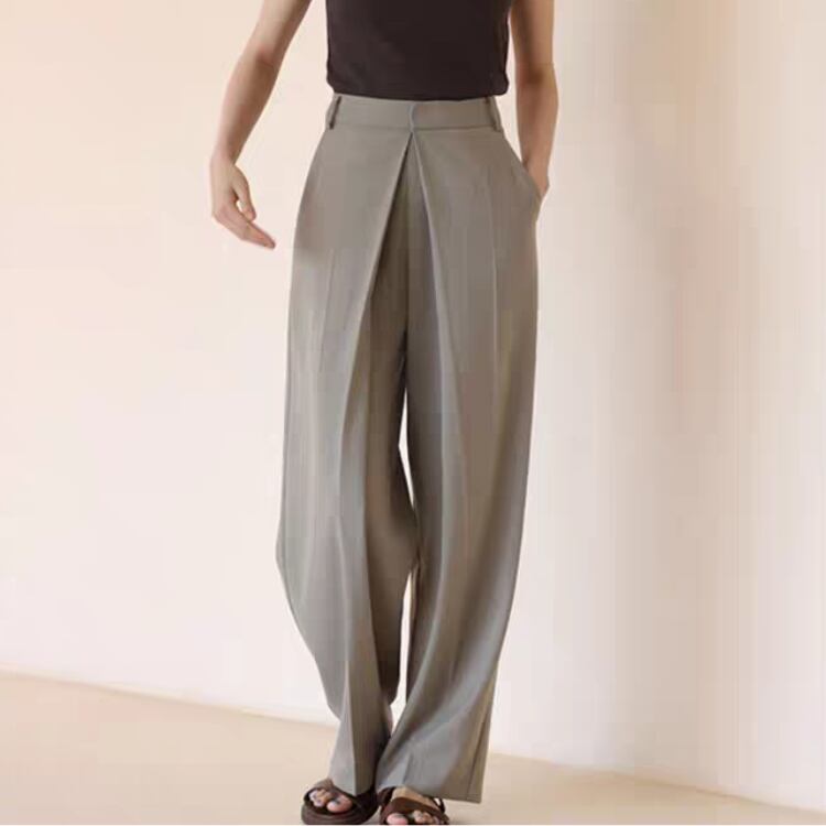 ウエストのフロントの中心に向かって生地が覆われ、モードな雰囲気がシックでおしゃれです。