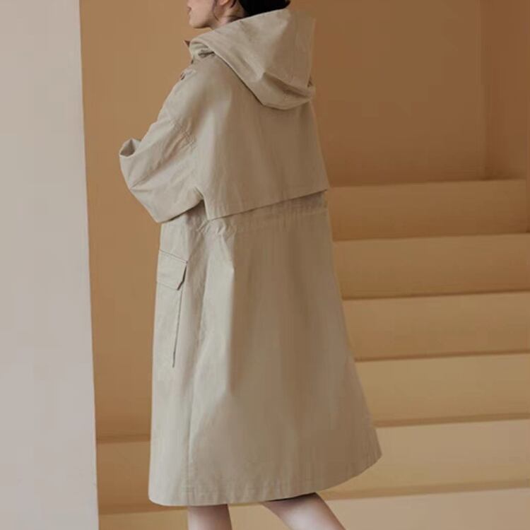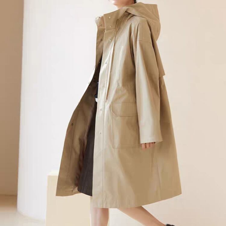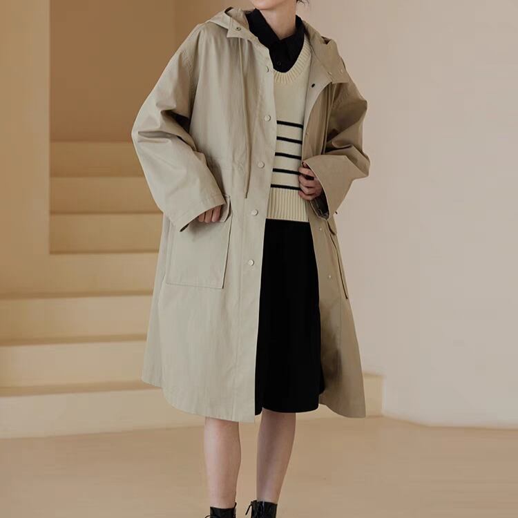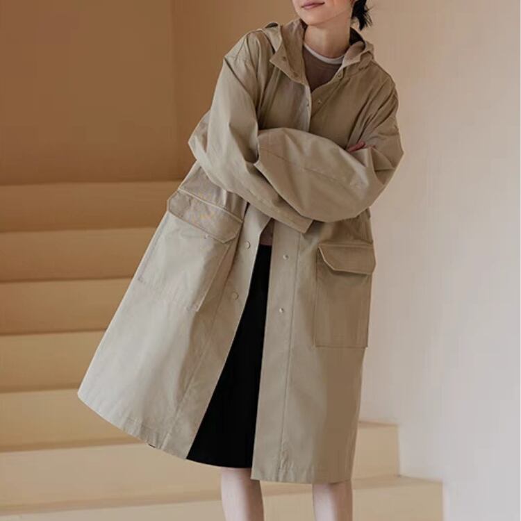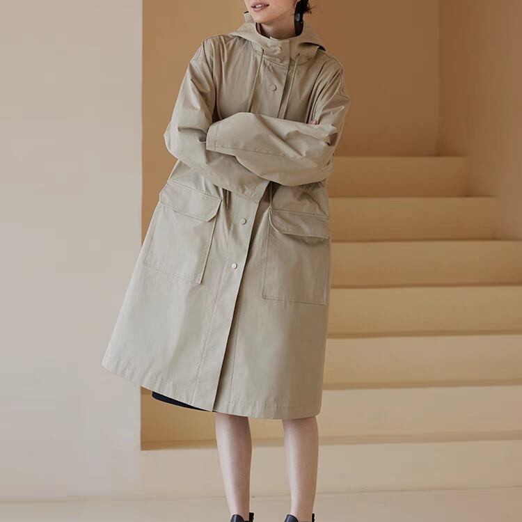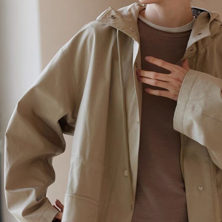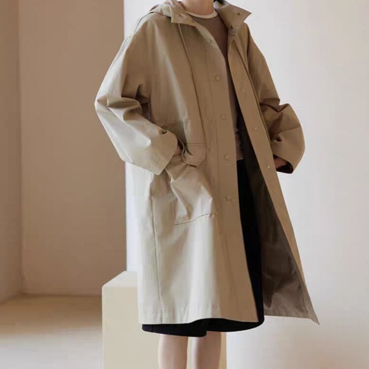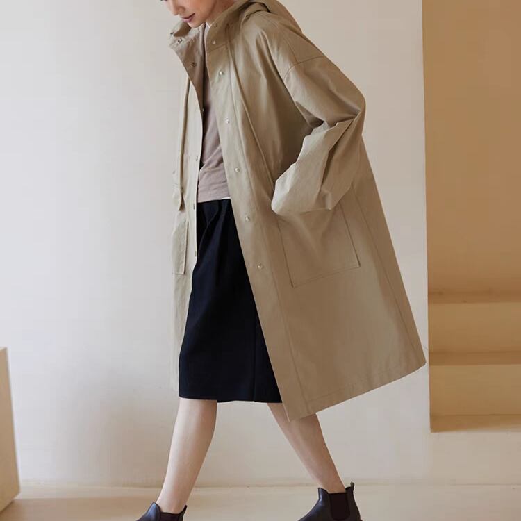 フード付きのシンプルな型で、軽くて着心地も良く、ボトムスを選ばず合わせやすいコートです。