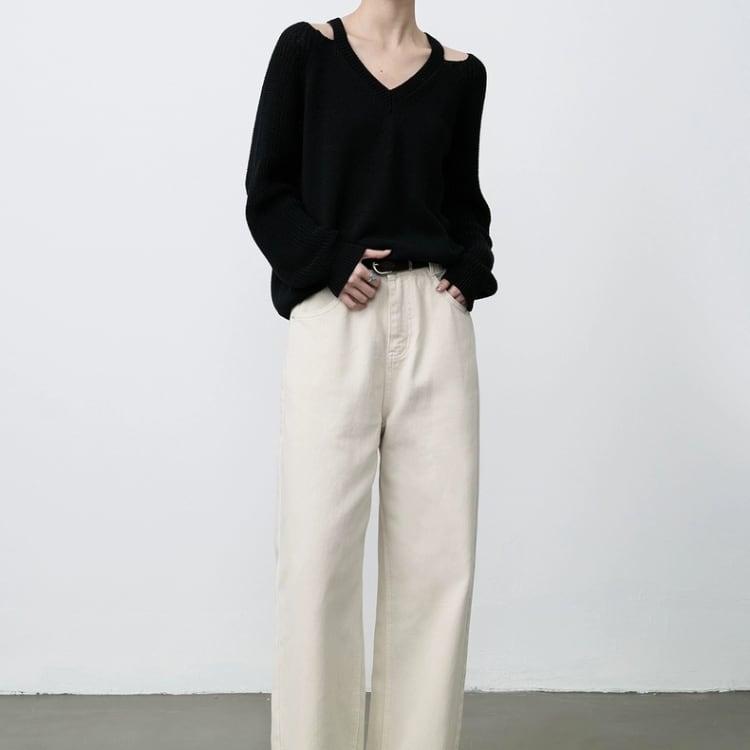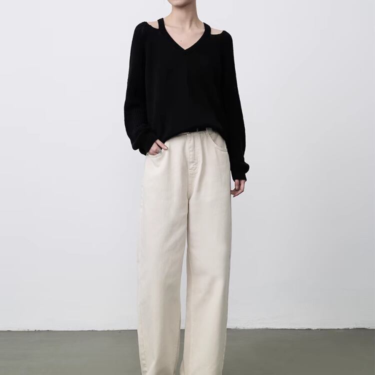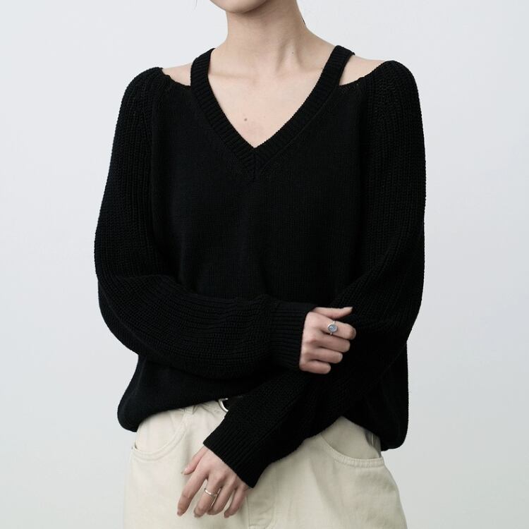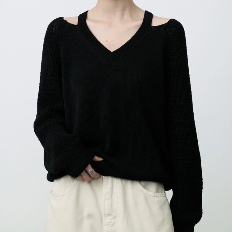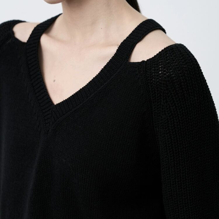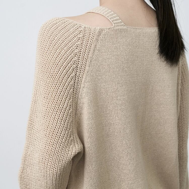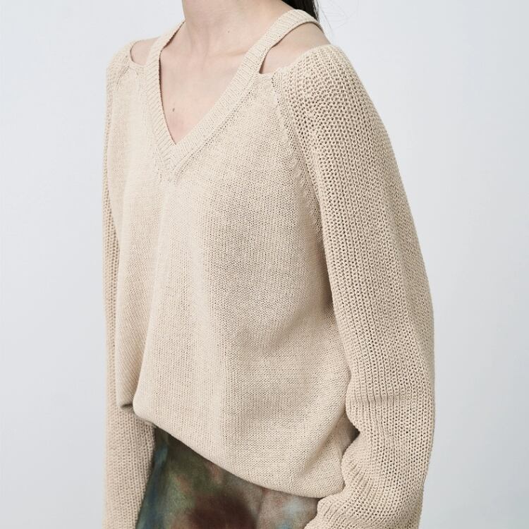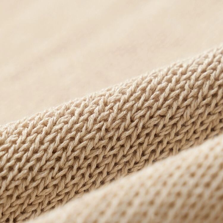 身頃と違う目が粗い編み地をお袖に配し、薄手に仕上がっているため、初夏まで長く着用していただけます。