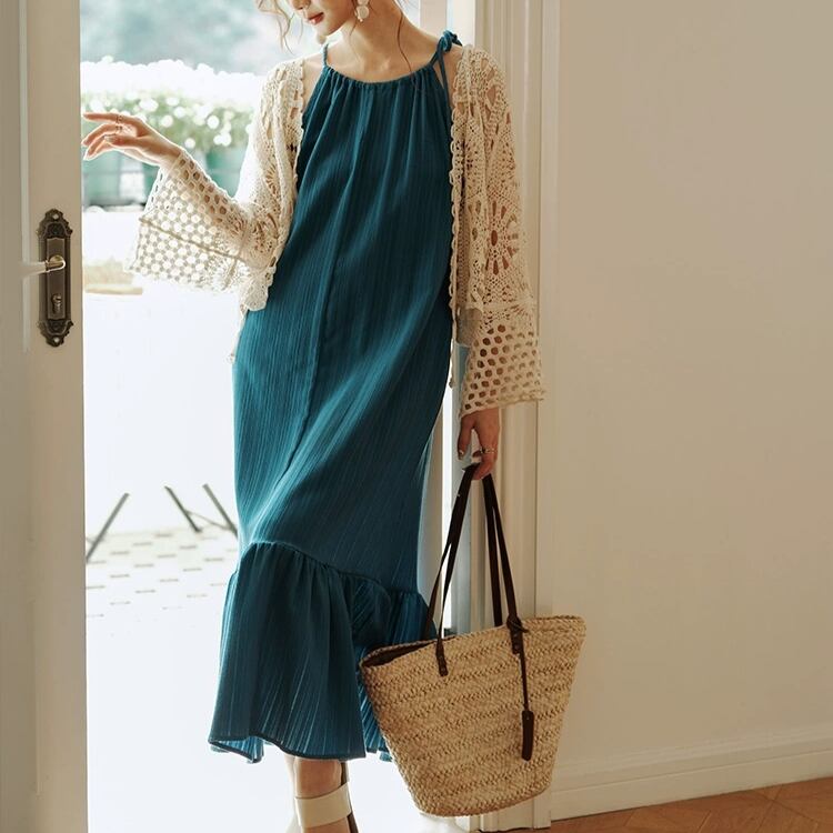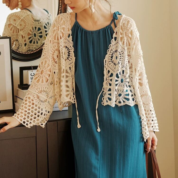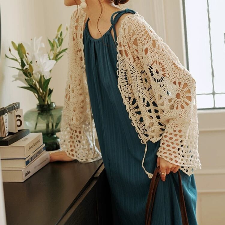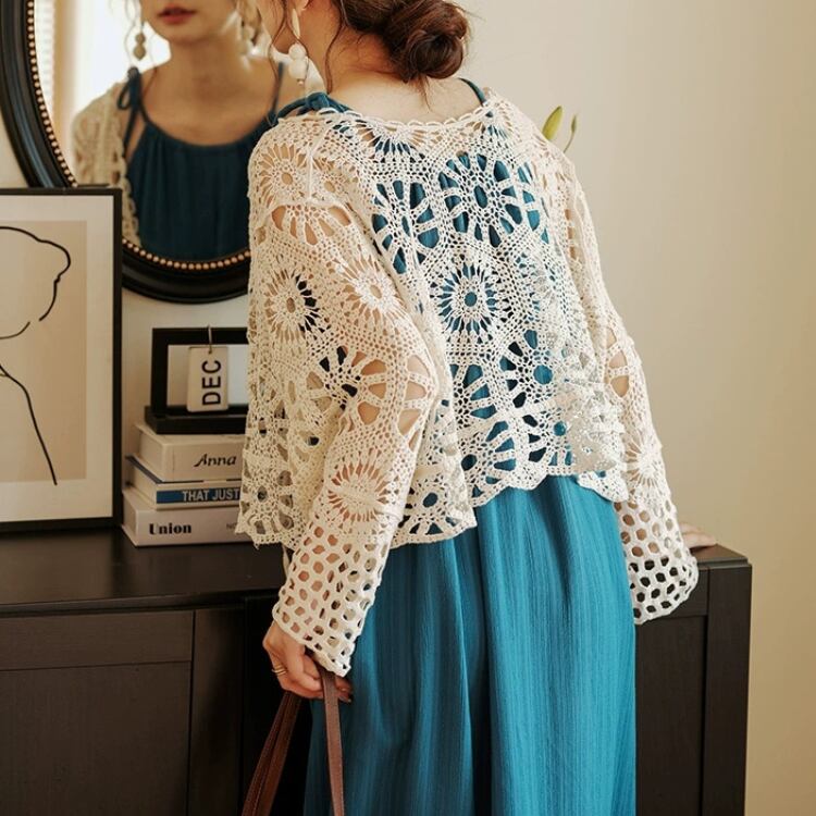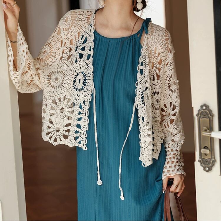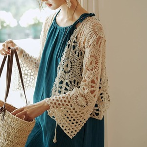 花のモチーフ編みのような透かし柄で、暑い季節にもさっと羽織れるとても便利なアイテムです。