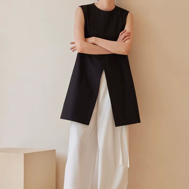 前面に施されたスリットがポイントのデザインで、チュニック丈ブラウスとして、パンツやナロースカートに格好良く映えます。