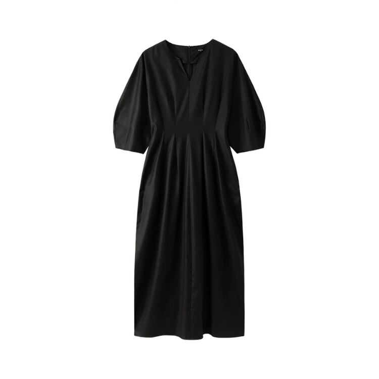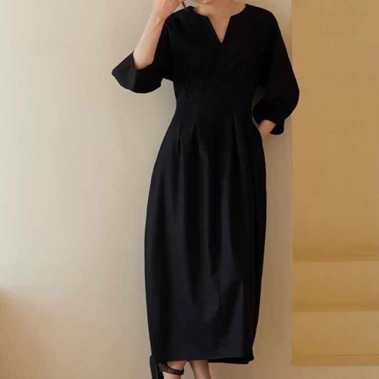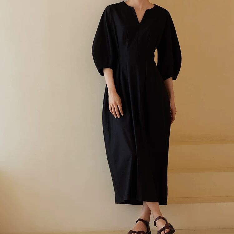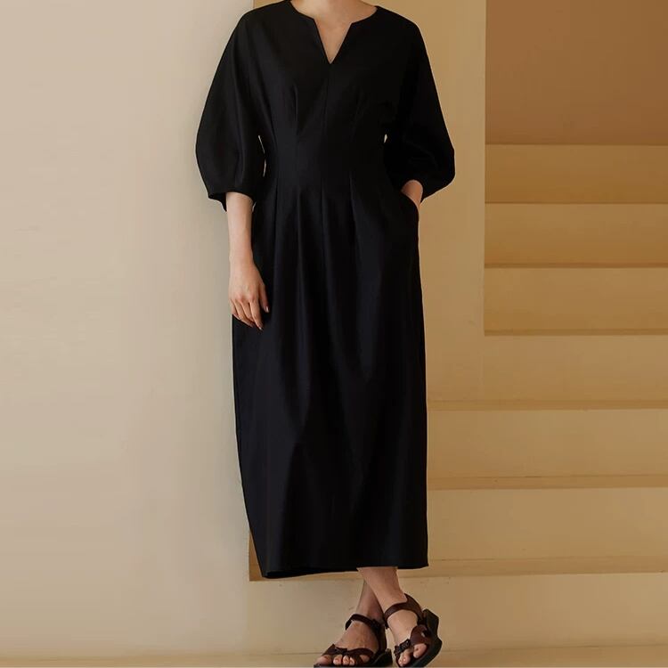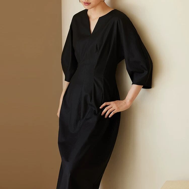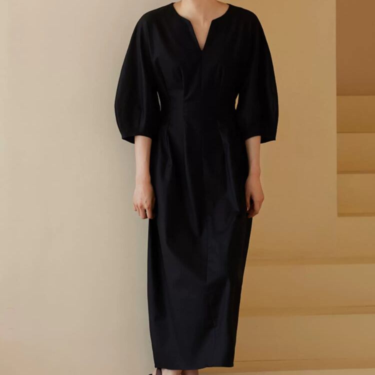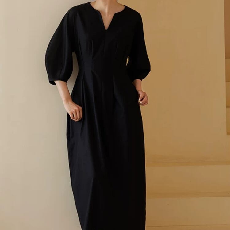 キーネック6分丈ボリュームスリーブウエストタックワンピース 0801