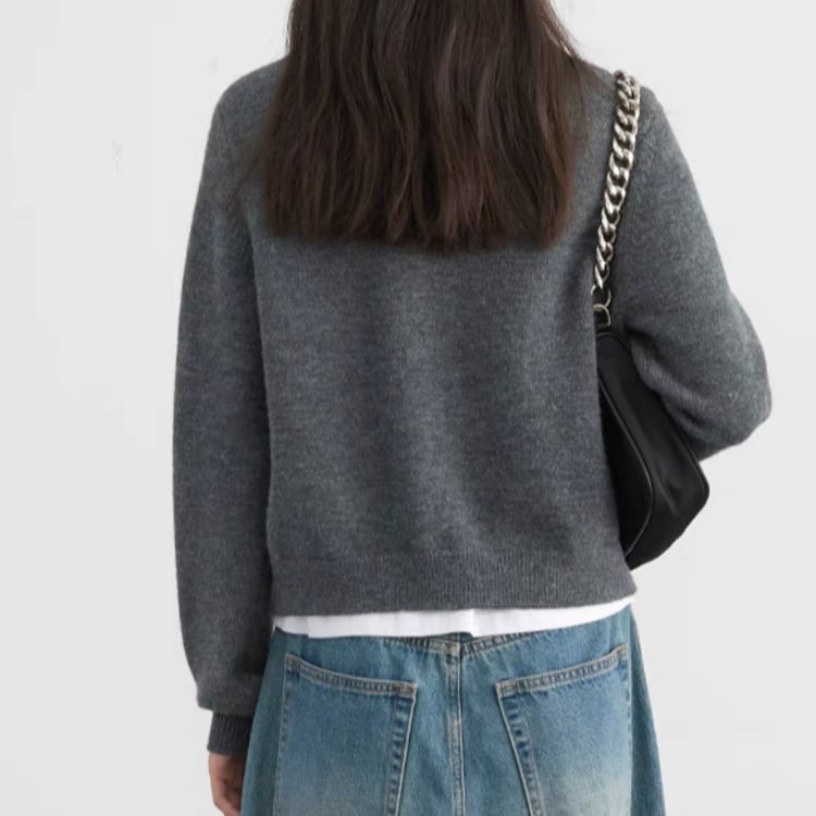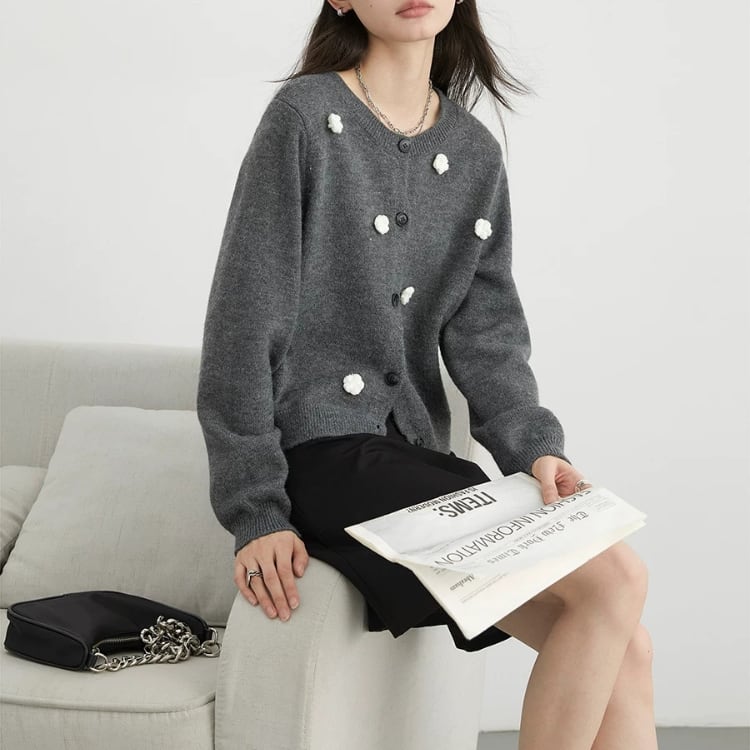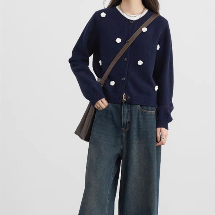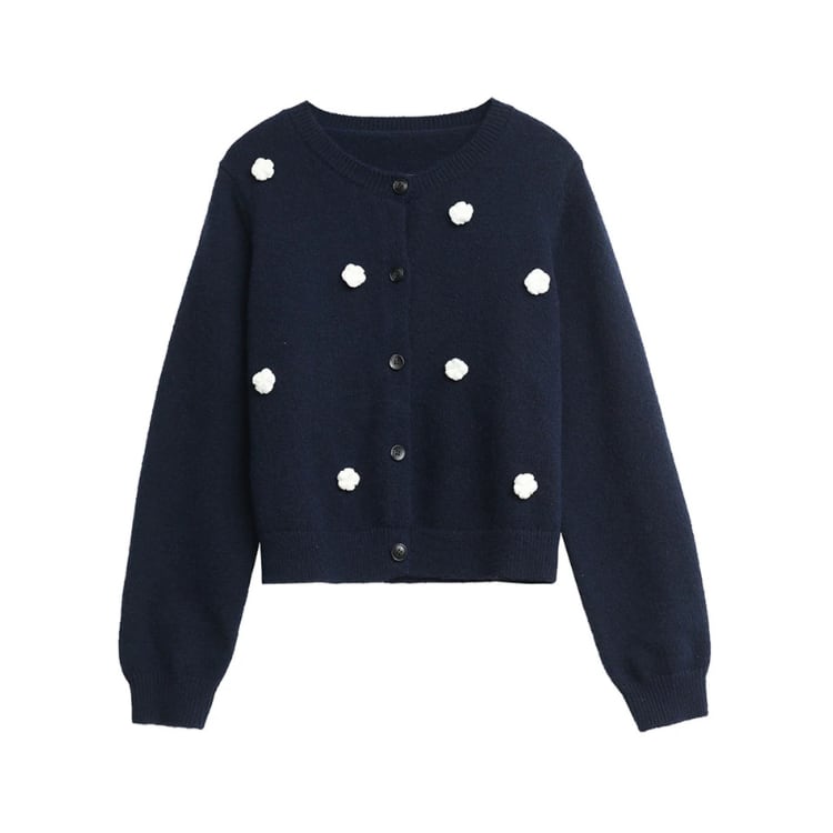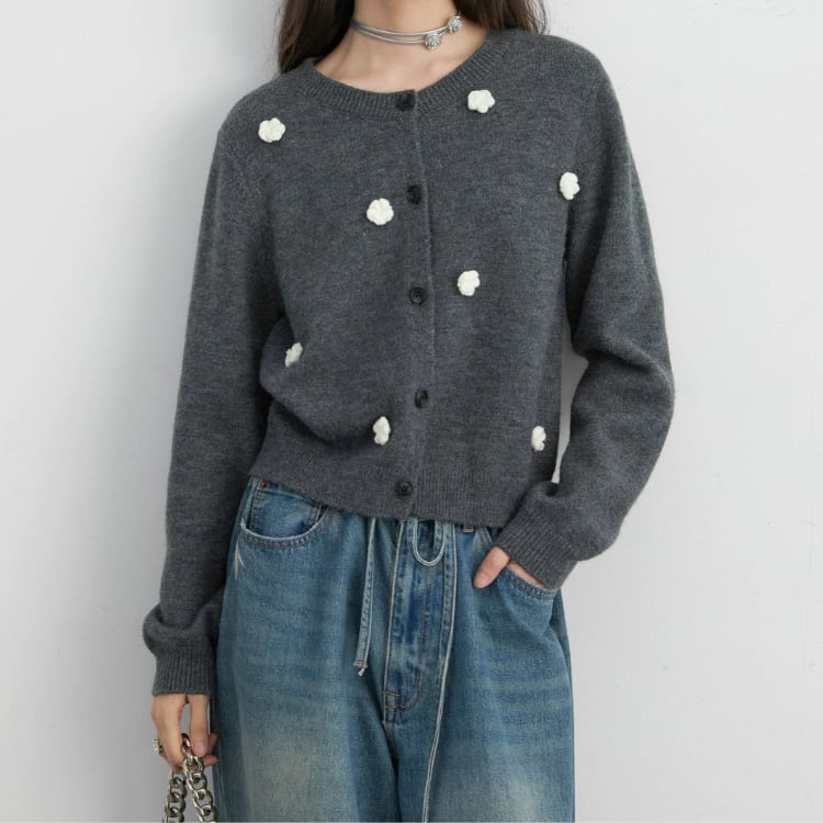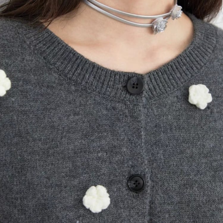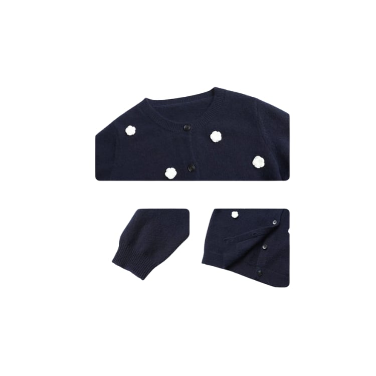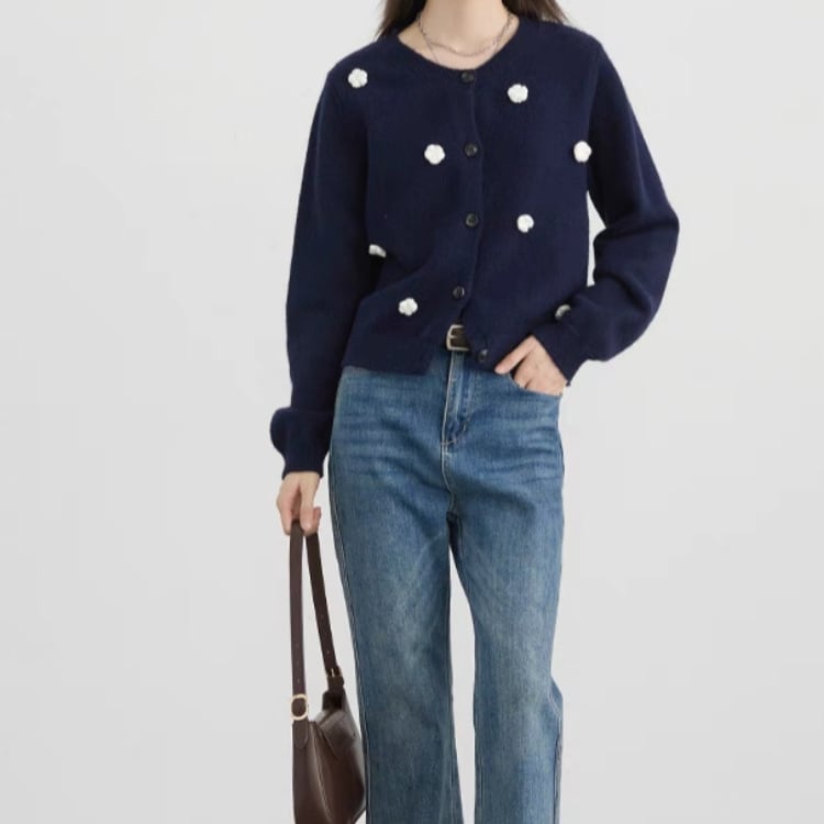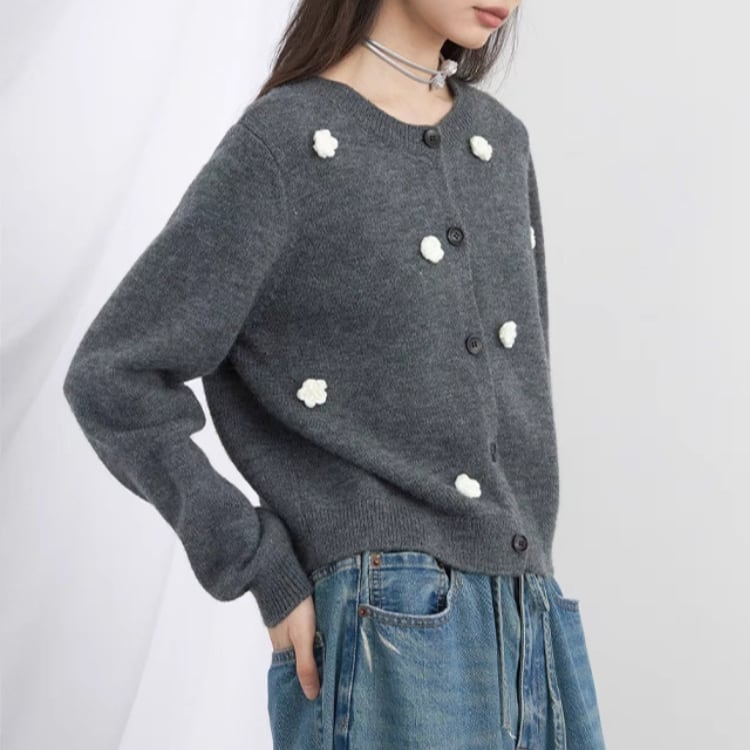 定番のクルーネックカーディガンに小さな白い花のモチーフを点在させたデザインが特徴です。