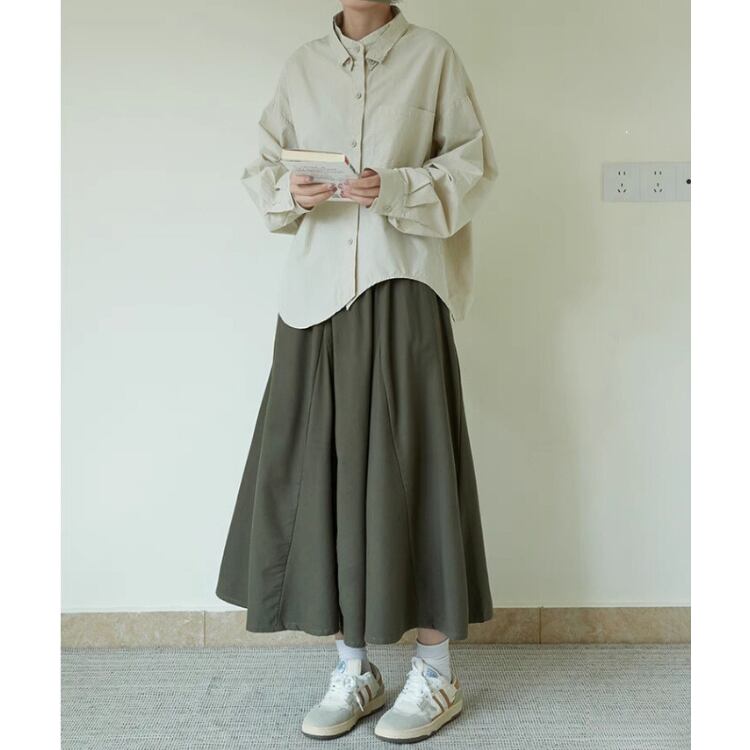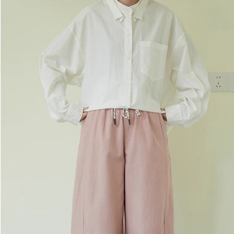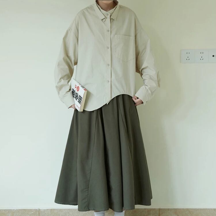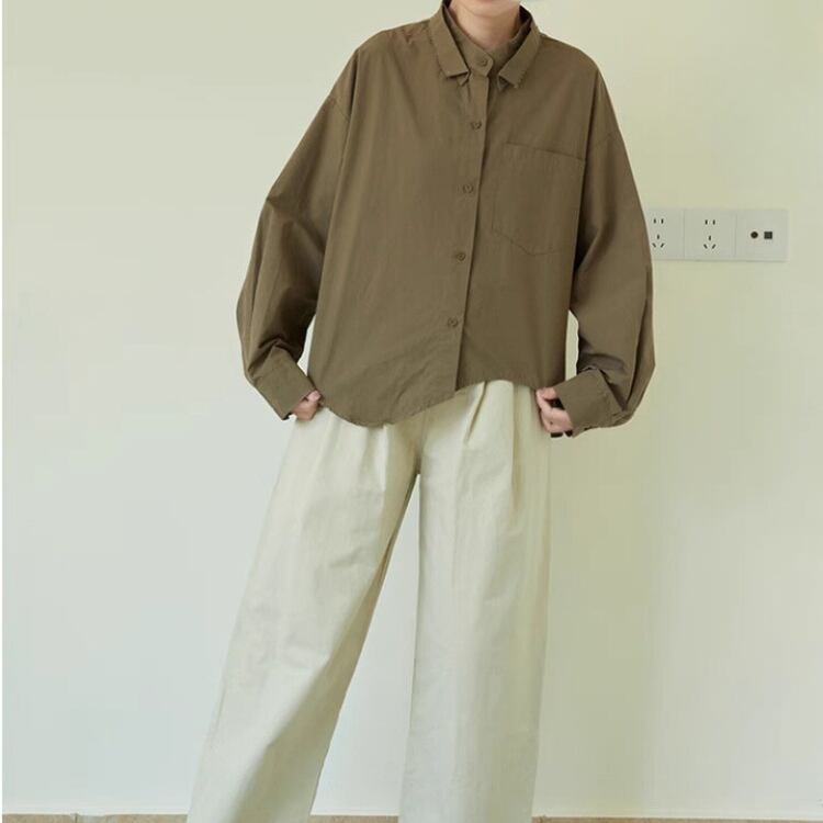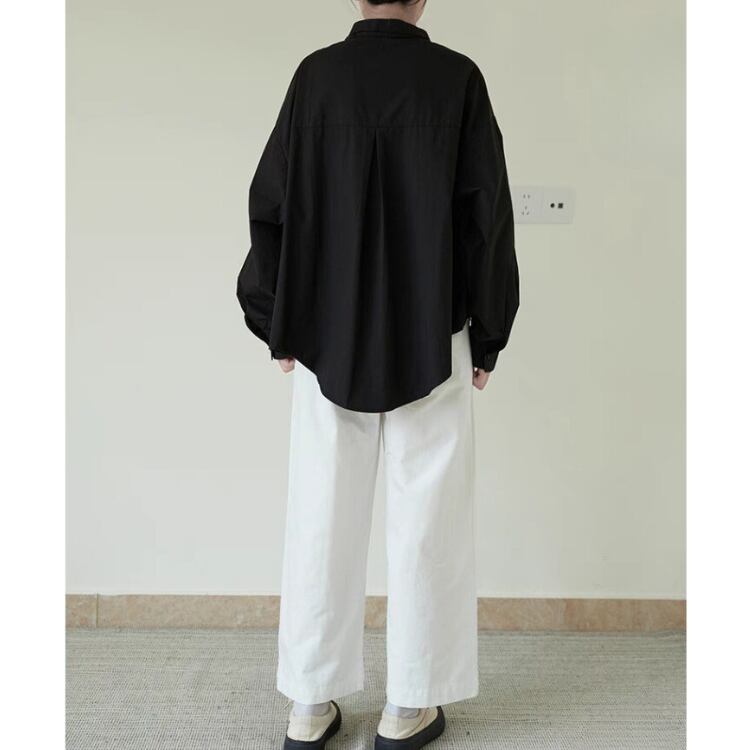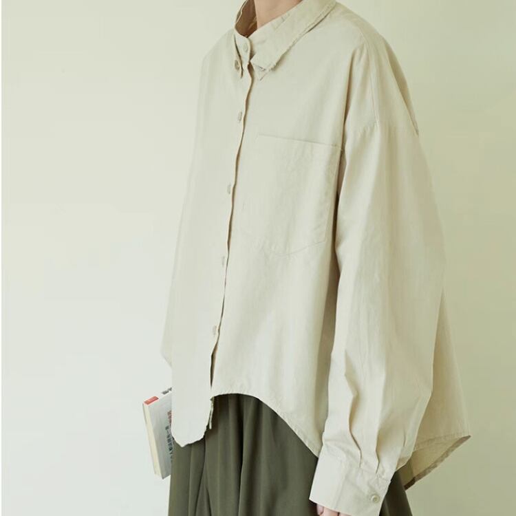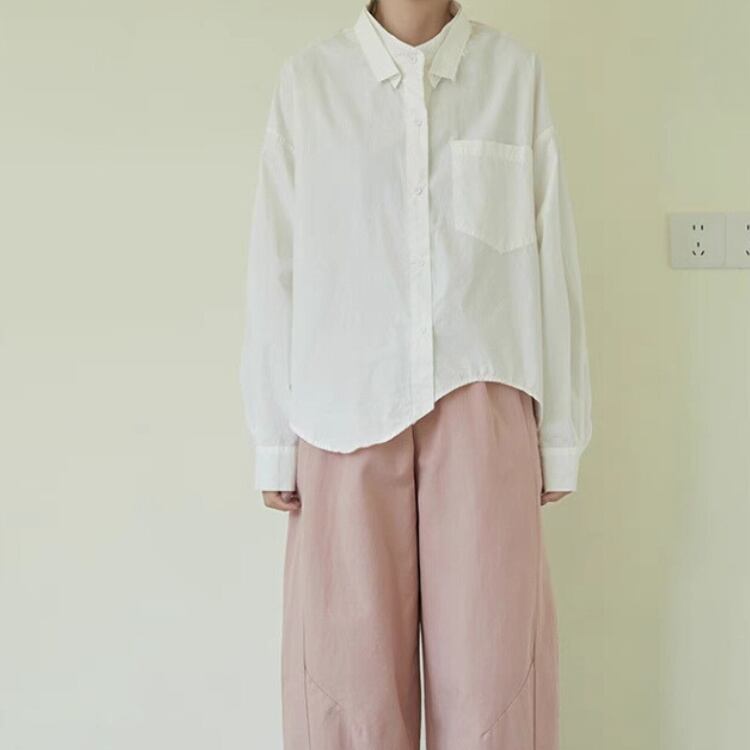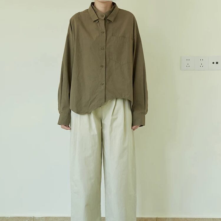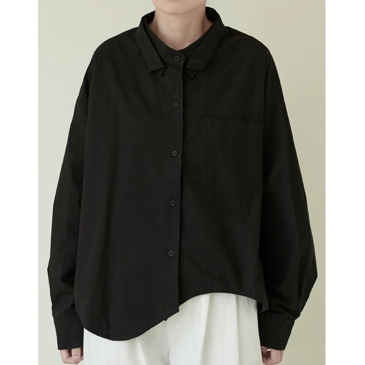 カットオフカラー付きバンドカラーアシンメトリーラウンドカットヘムシャツ 0836