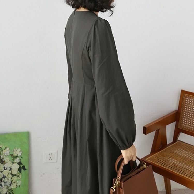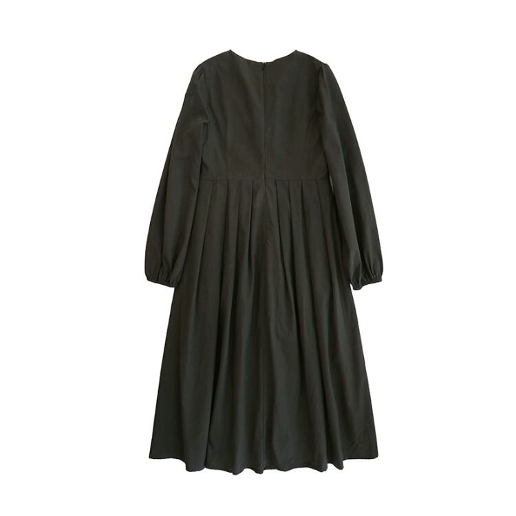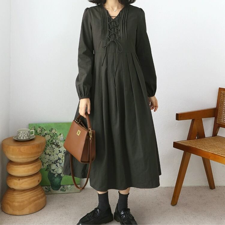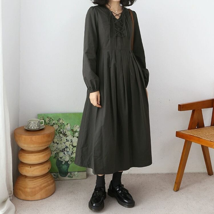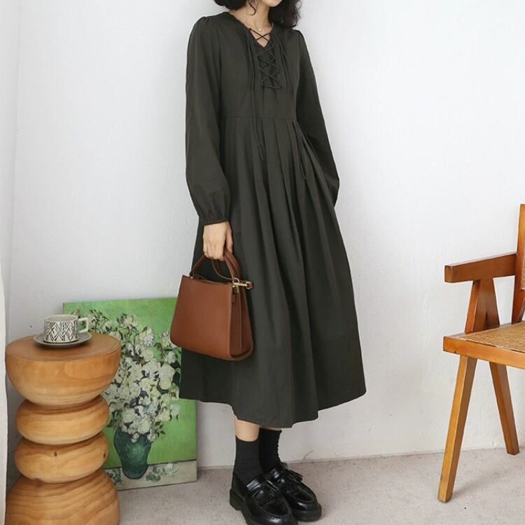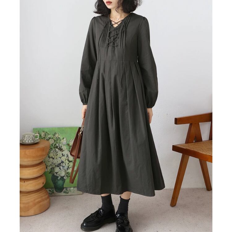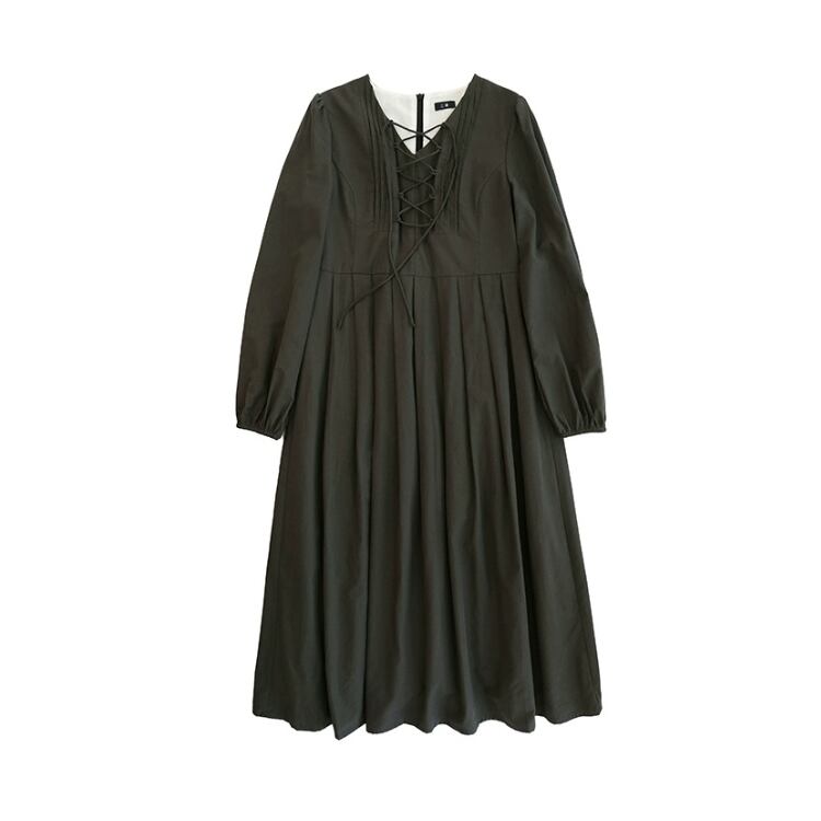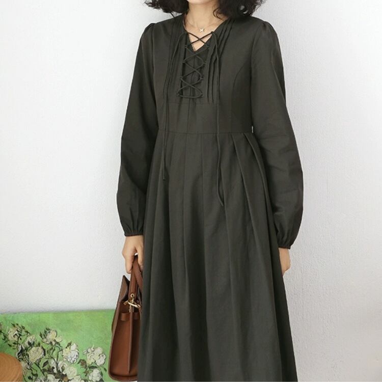 レースアップVネックヨークピンタックハイウエストタック切り替えワンピース 0857