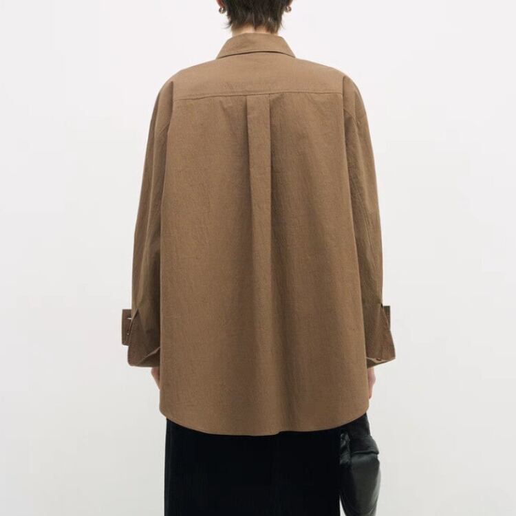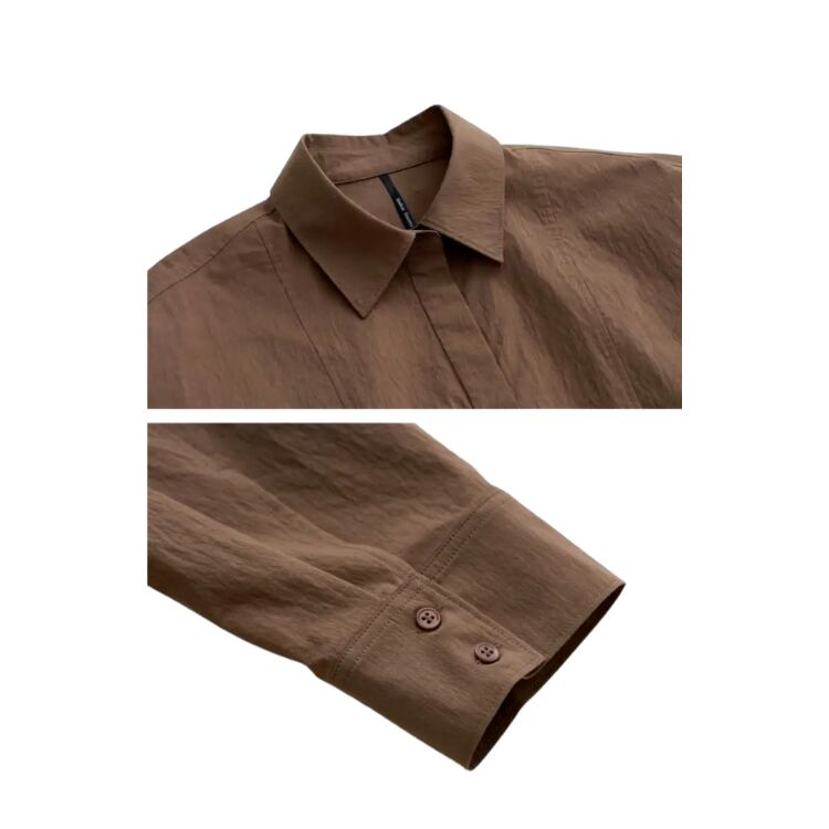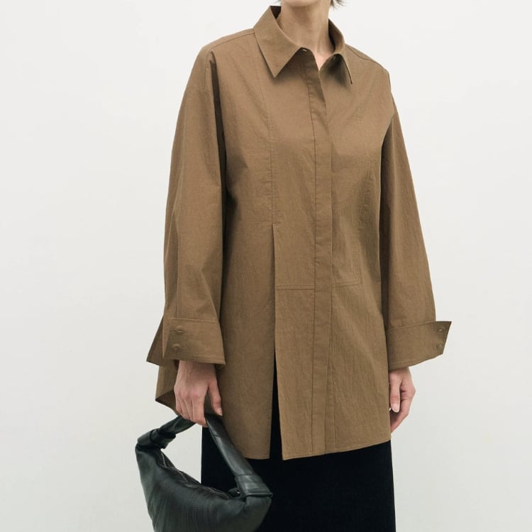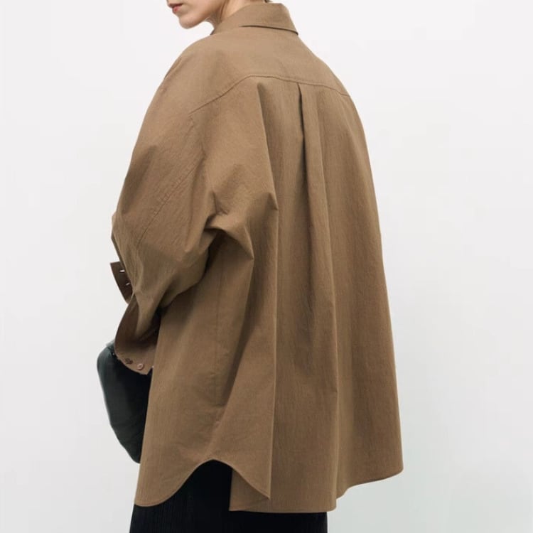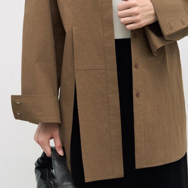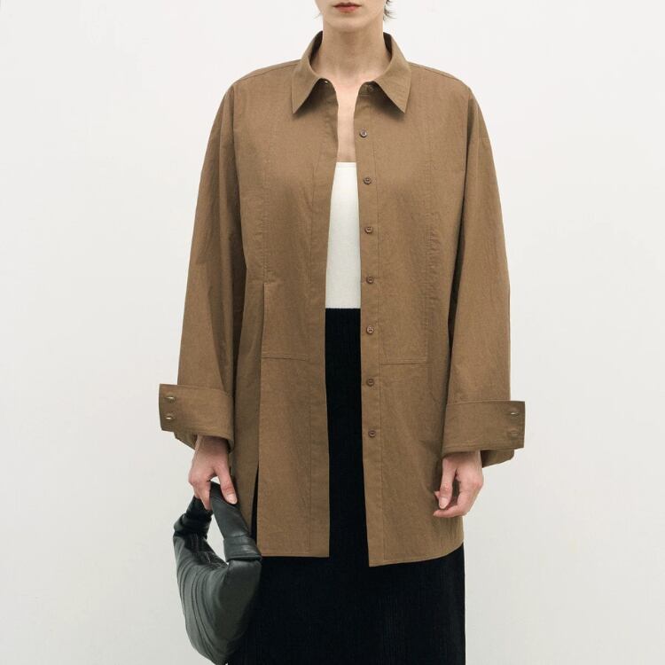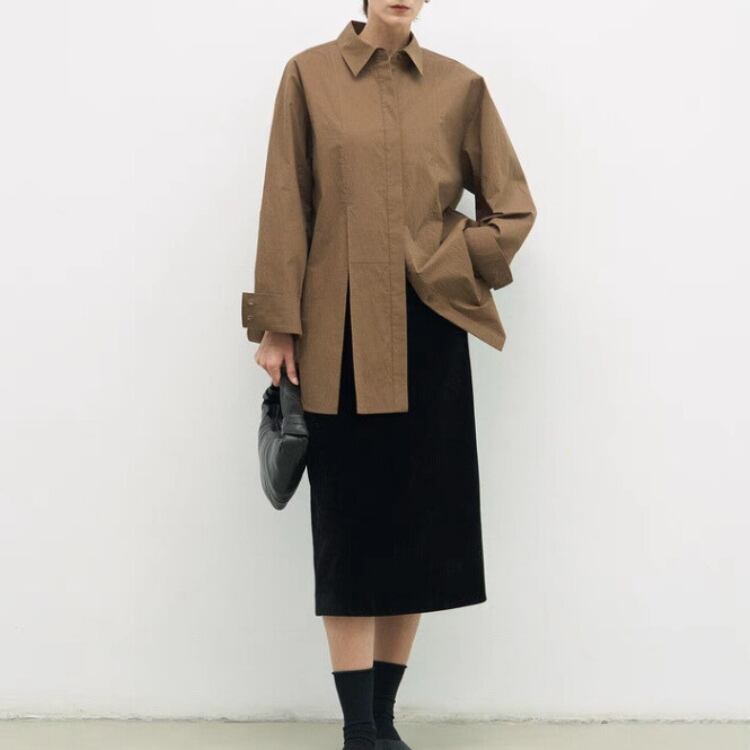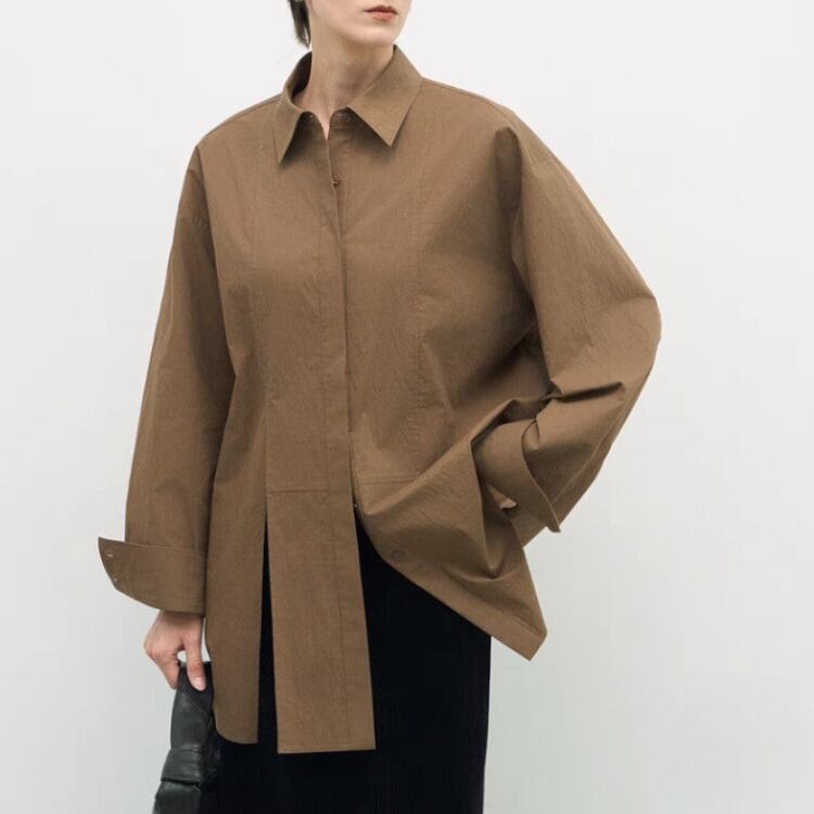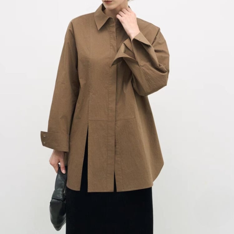 フロントの片側にスリットを施した個性的な印象のシャツブラウスです。