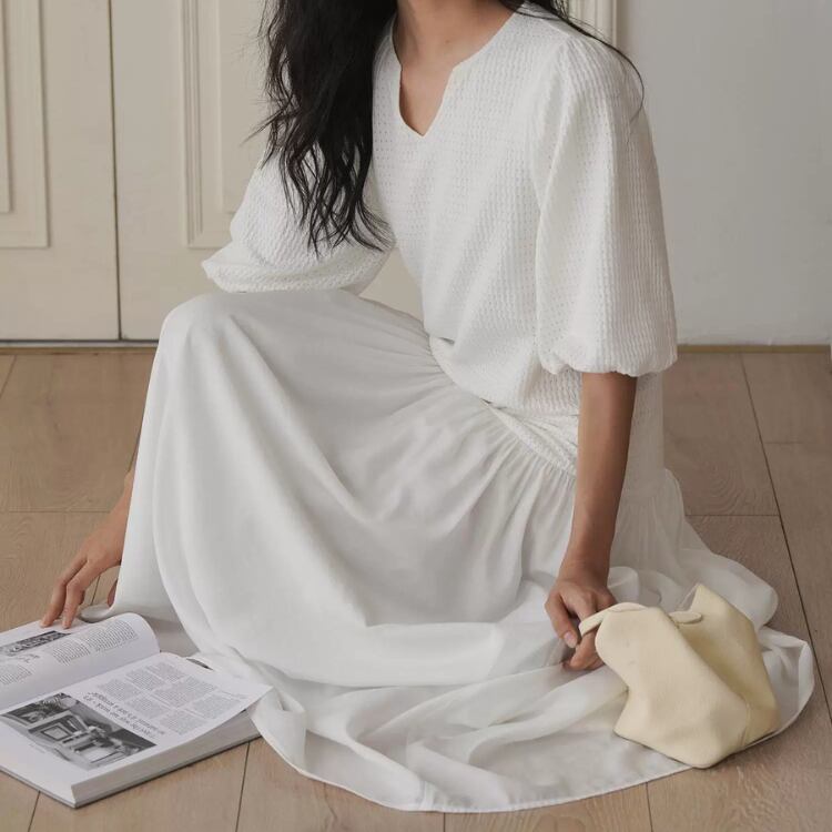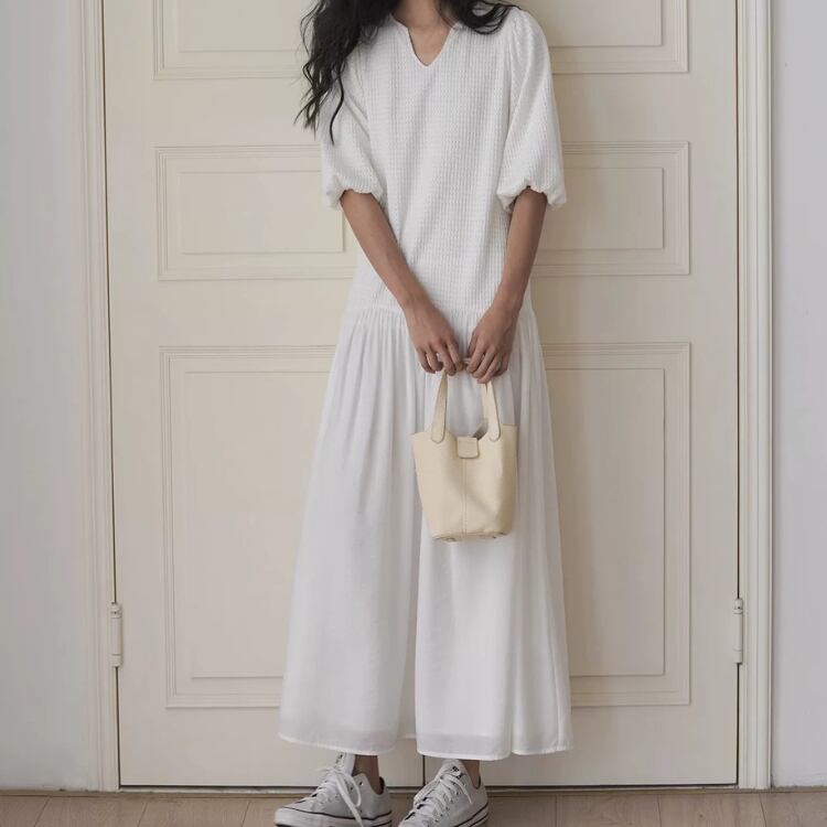 ローウエストの切り替えデザインは、スタイルを美しく見せると共に、落ち感のあるテロンとした生地が女性らしさを演出します。
