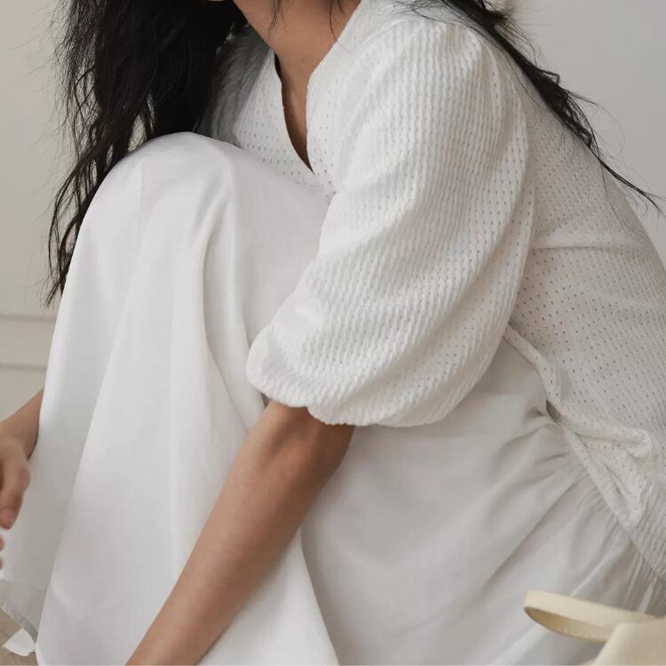 縦に畝と穴があるジャガード生地とシアー生地の配色が、華やかさを引き立てます。