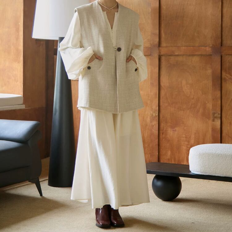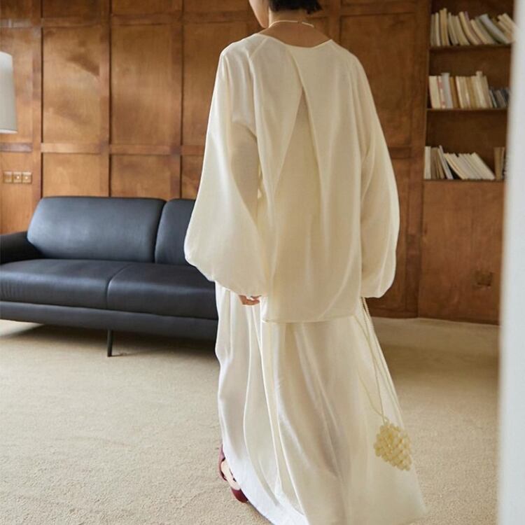 長めの着丈やゆったりとしたシルエットでも、テロンとした落ち感のある生地が軽やかに映り、フェミニンな雰囲気を演出する一枚です。