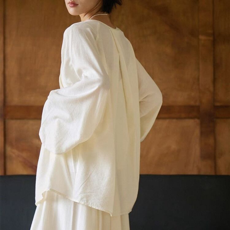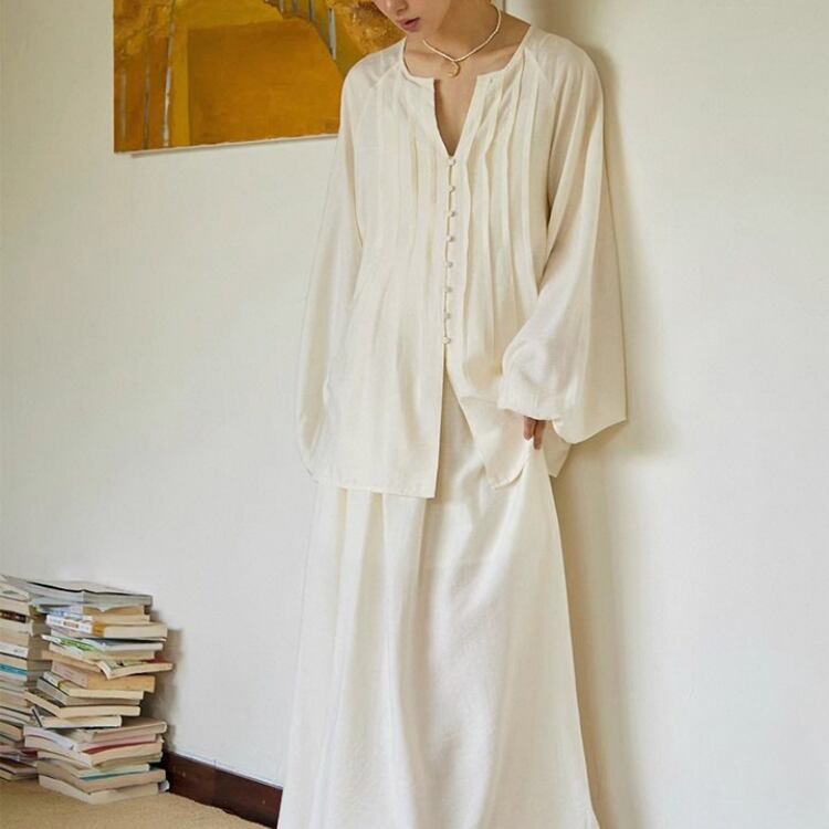 フロントのピンタックデザインがエレガントさを演出し、ふんわりとしたラグランスリーブが女性らしさを引き立てるブラウスです。