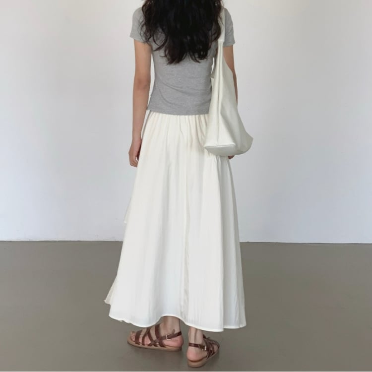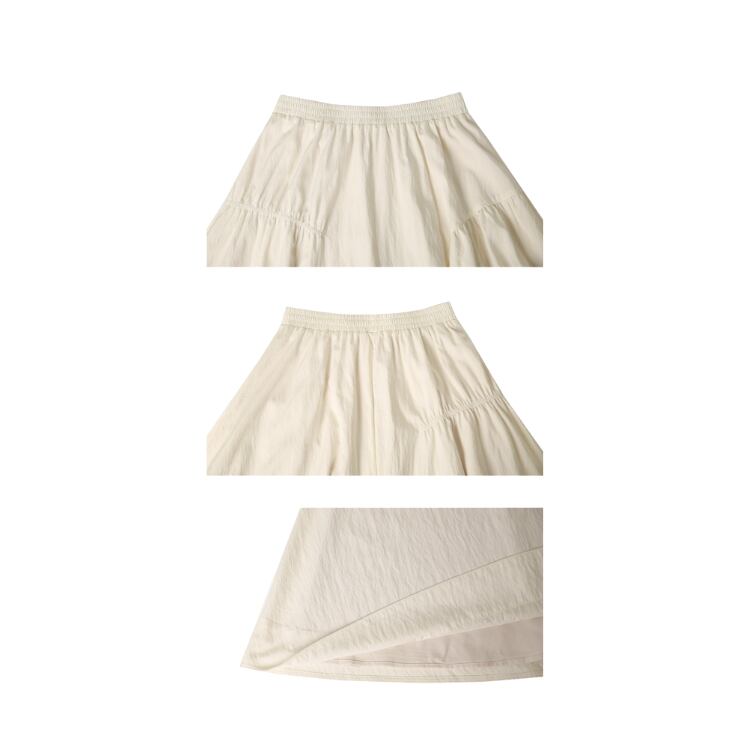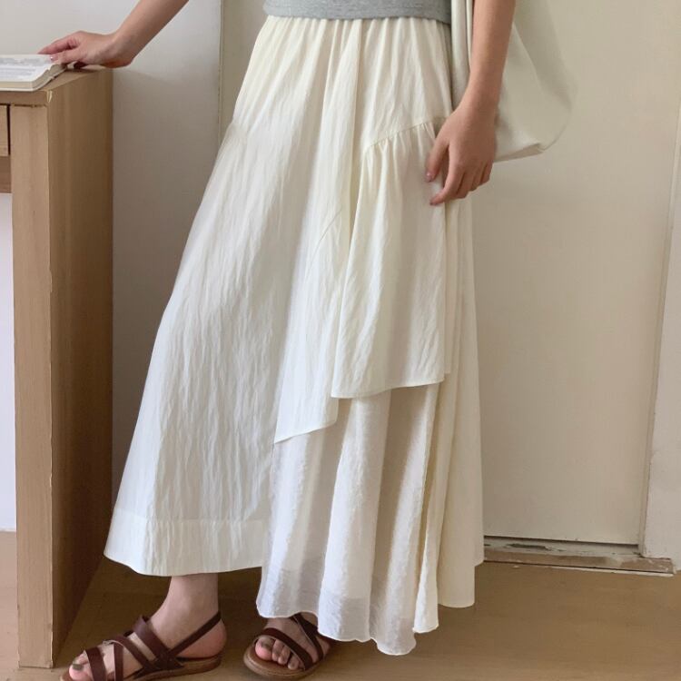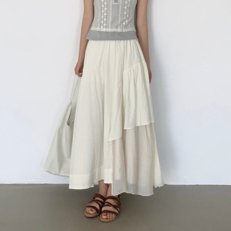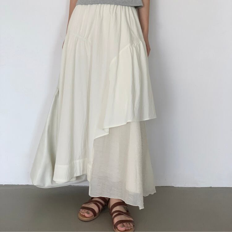 シアー生地配色アシンメトリーギャザー切り替えフレアースカート 0973