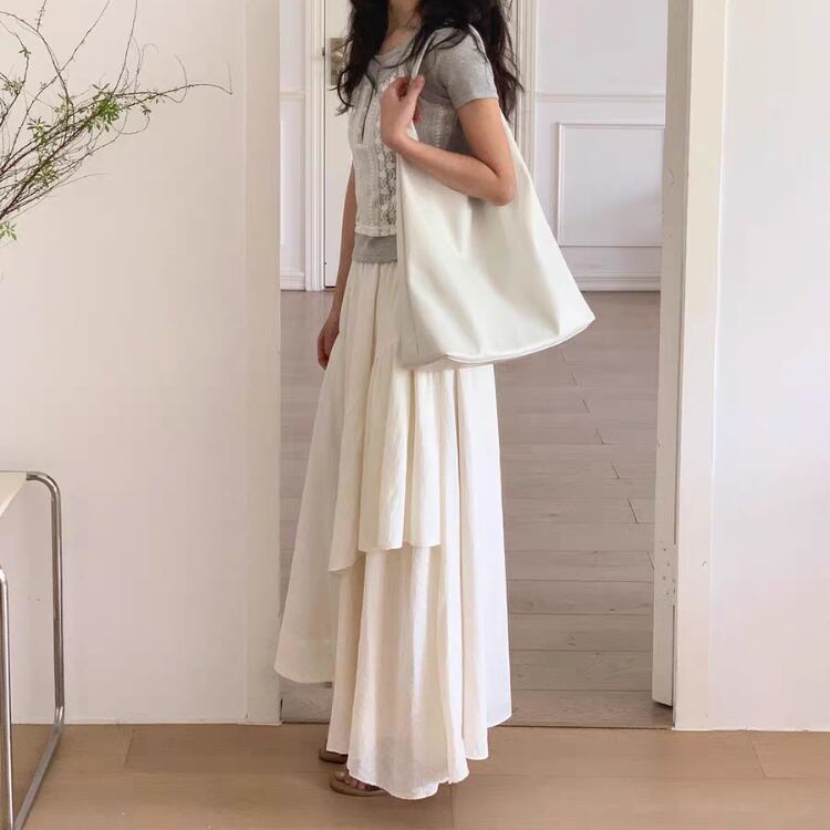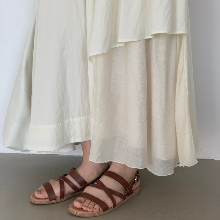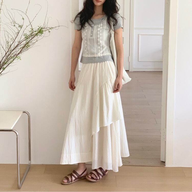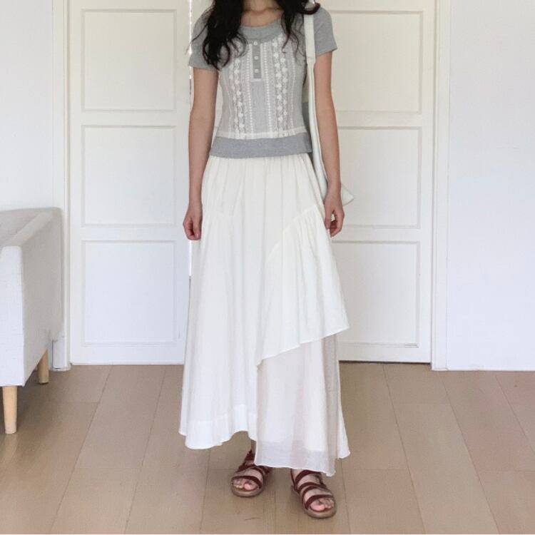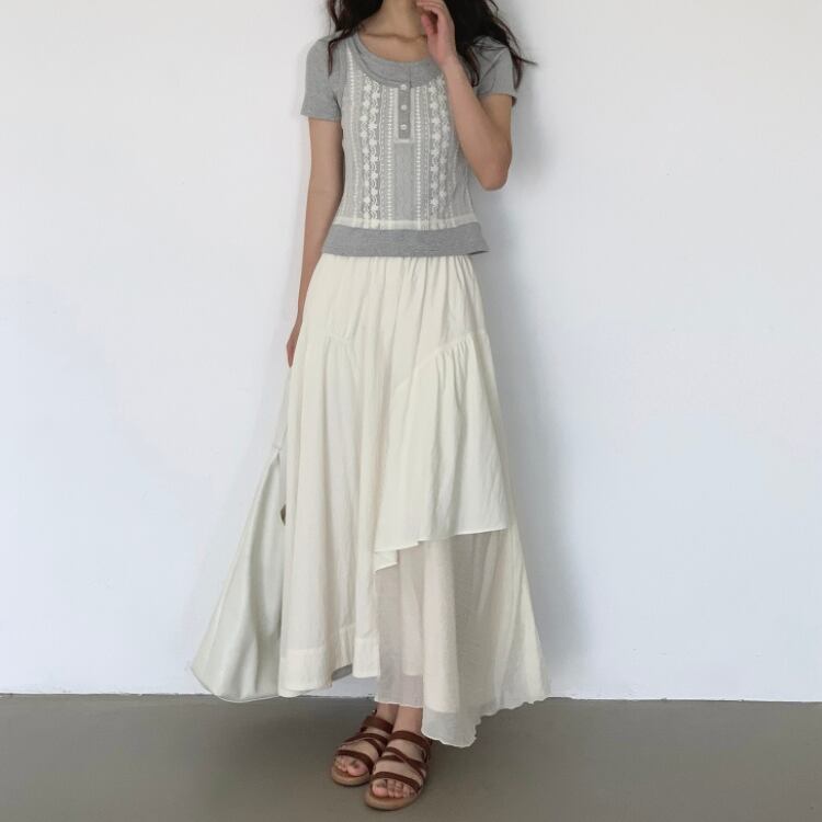 シアー生地を巧みに使用したアシンメトリーデザインのフレアースカートは、トレンド感あふれる魅力を放っています。