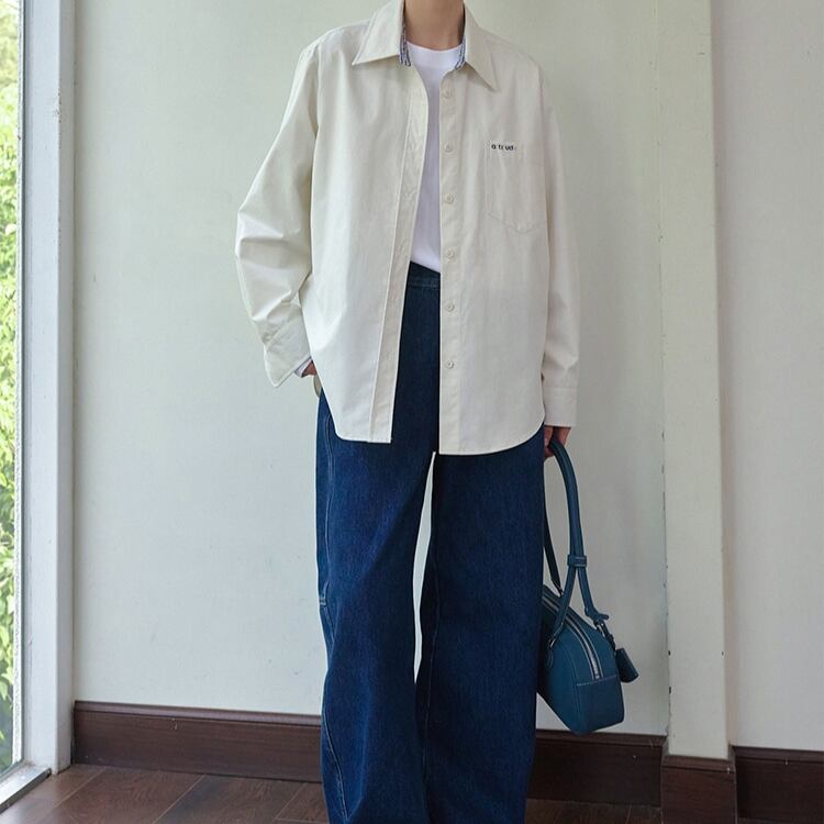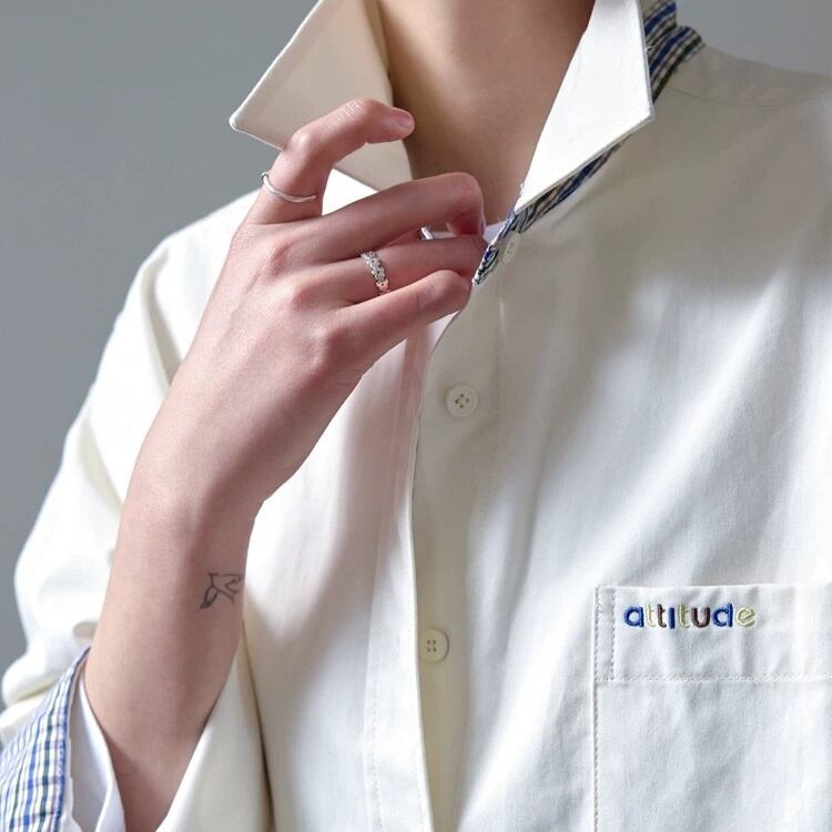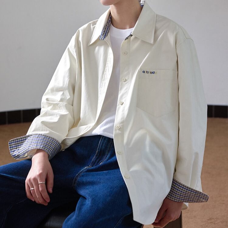 チェック柄配色ワンポイントレタリング刺繍シャツ 0966