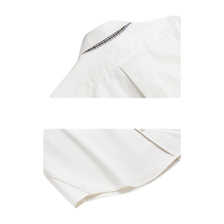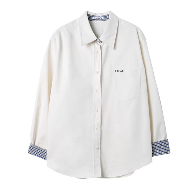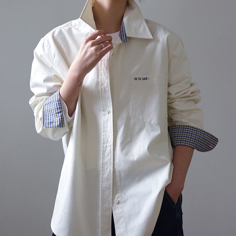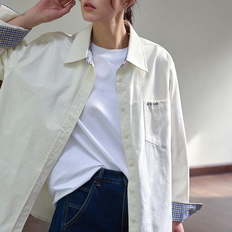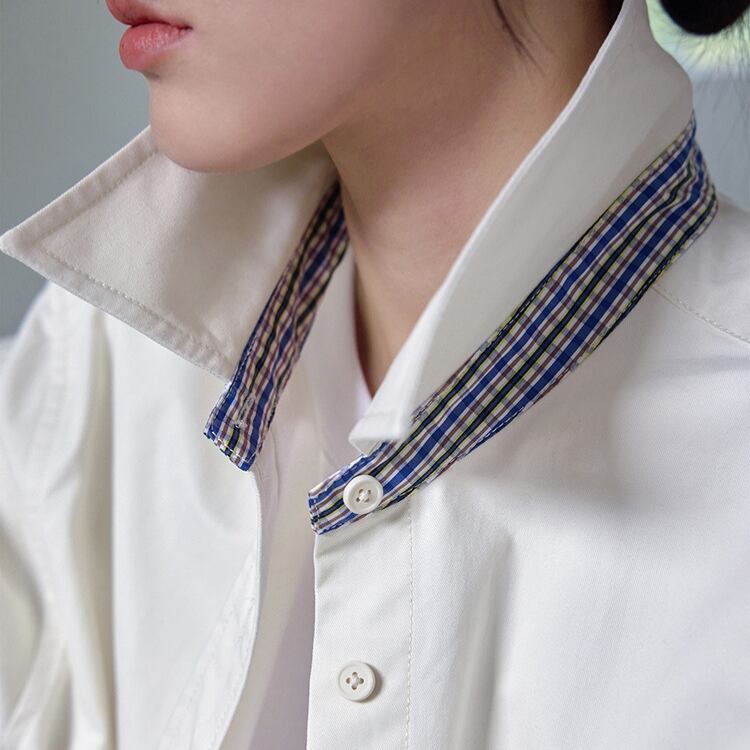 台襟と袖口裏に施されたブルーのチェック柄がポイントのシャツ。