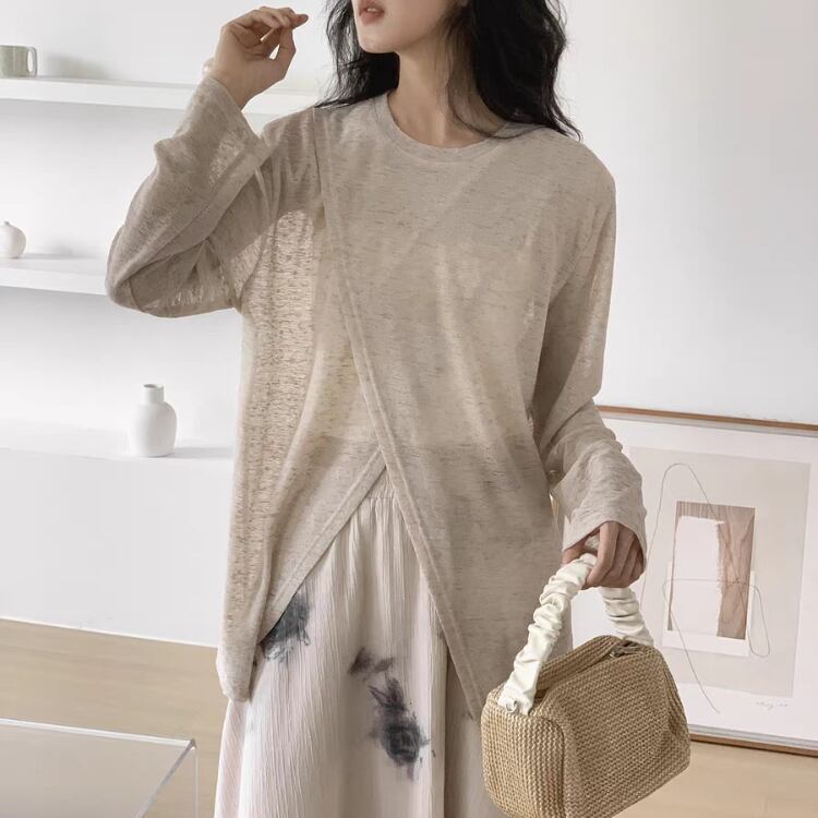 シアー素材を使用したレイヤードスタイルのカットソーは、シックさを引き立てるおしゃれなアイテムです。